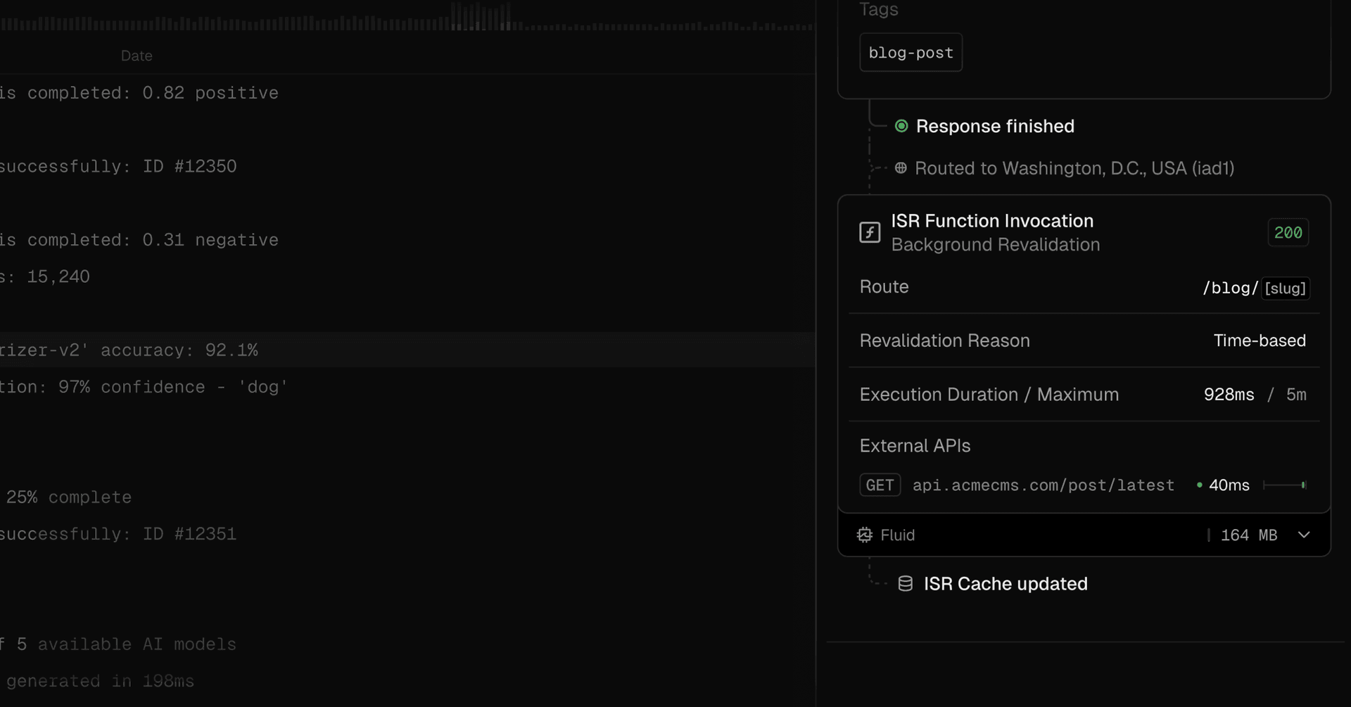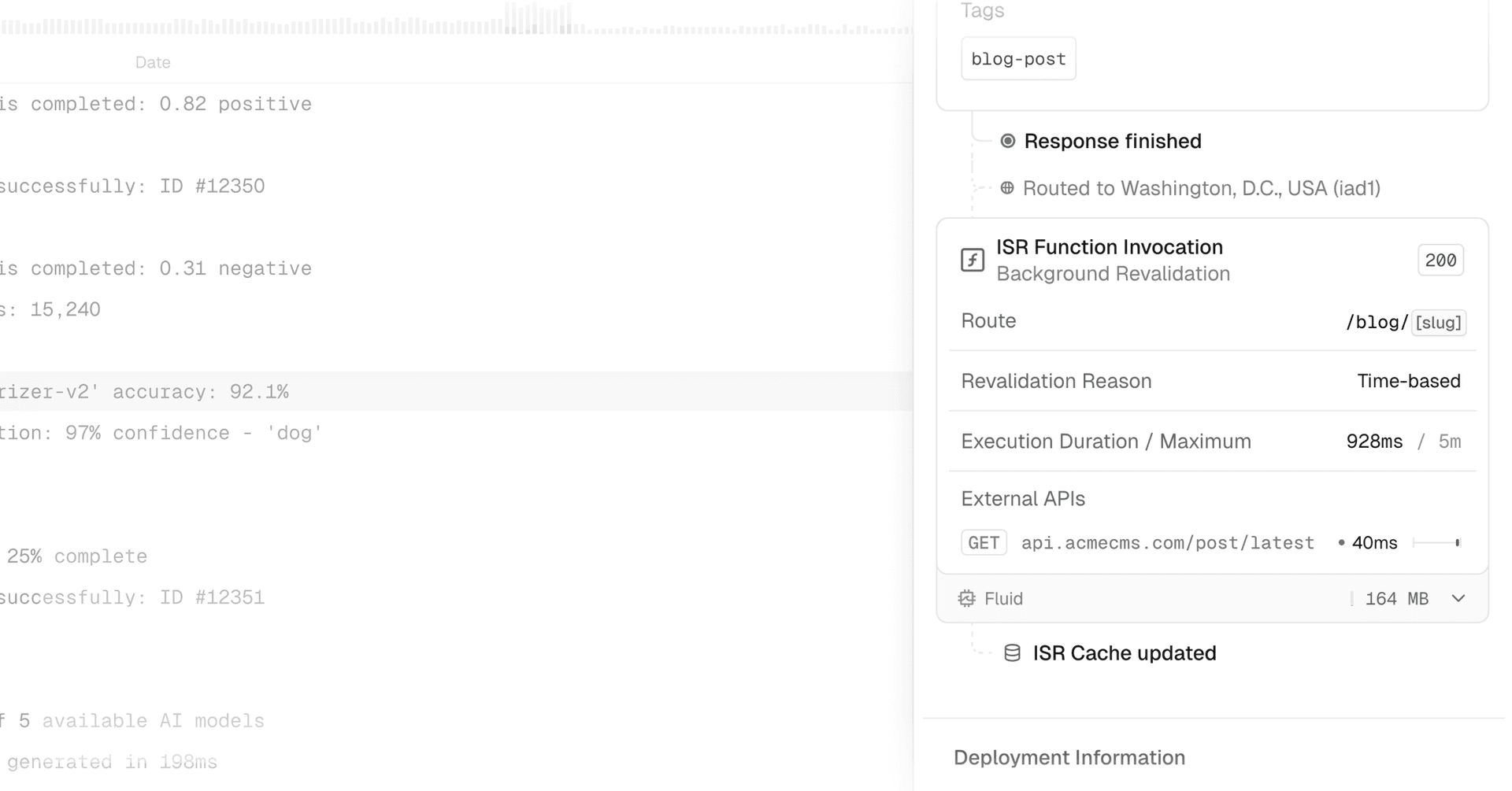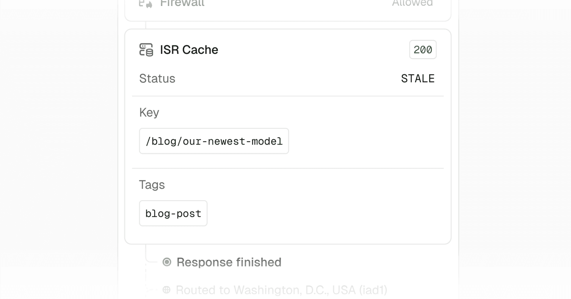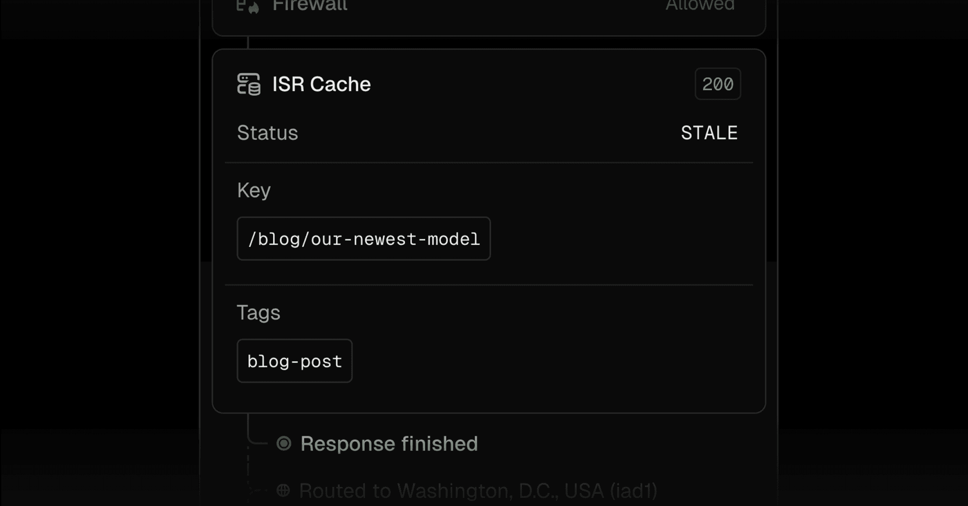 - Revalidation reason: If a revalidation took place, the reason why the content was being revalidated (time-based, tag-based, or deployment-based)