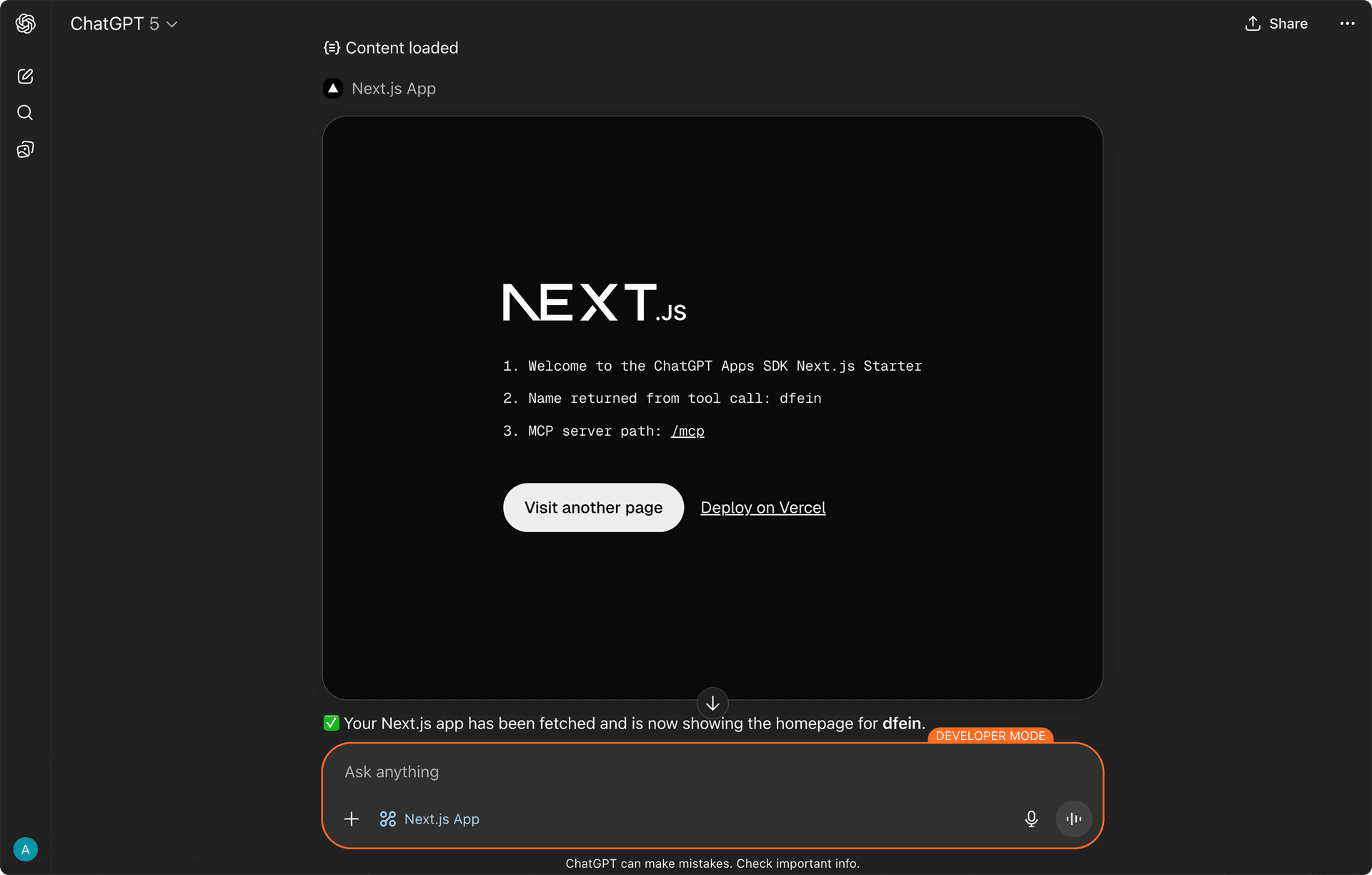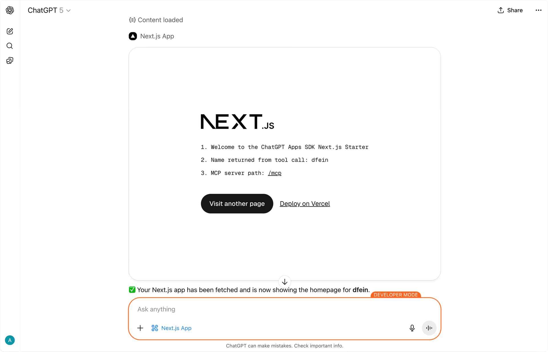 Frameworks like Next.js can now power these experiences using the Model Context Protocol (MCP), running natively inside the OpenAI sandbox rather than in a nested iframe. Check out our Next.js template.