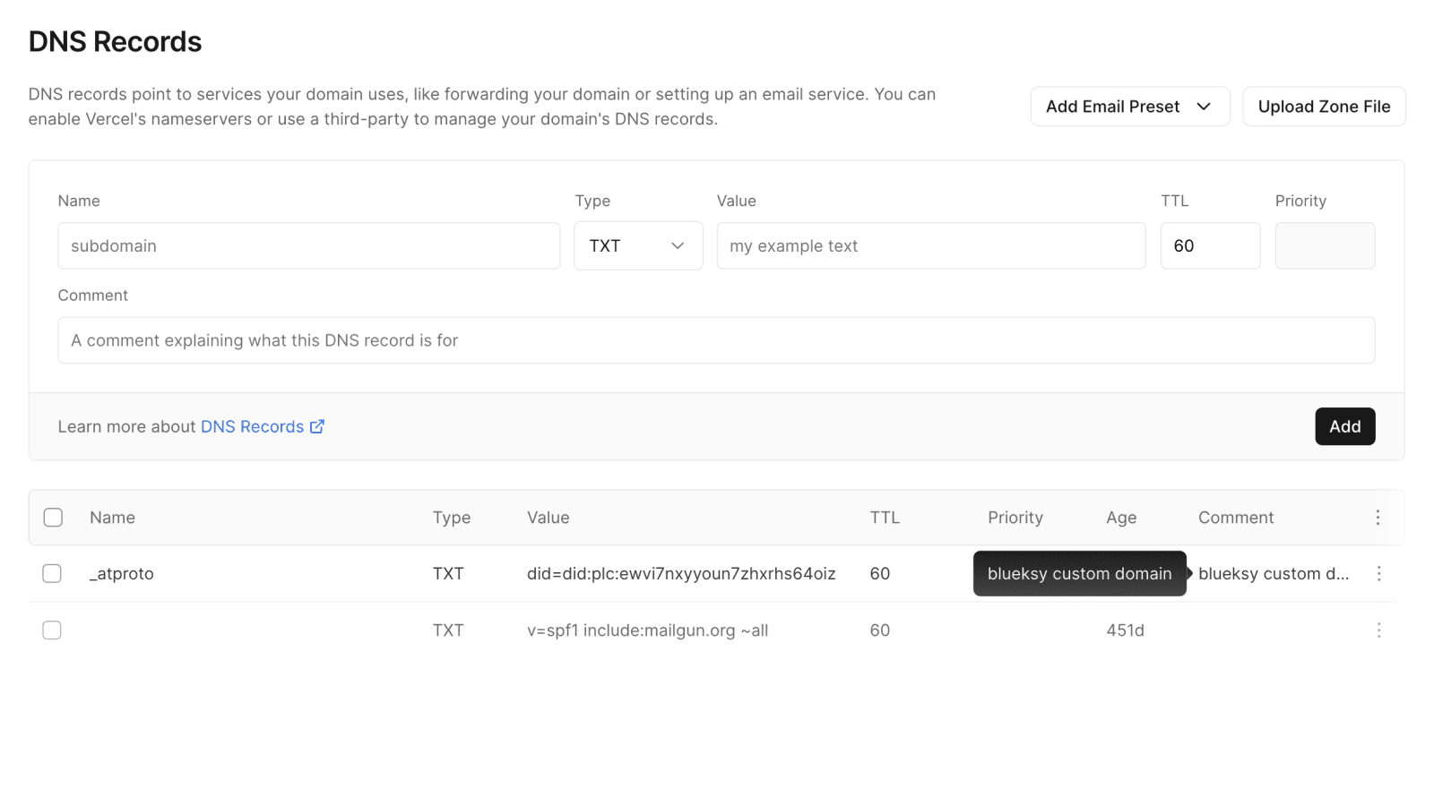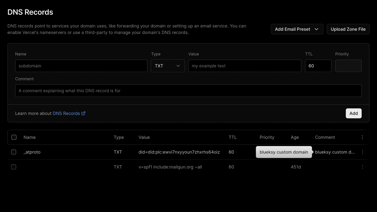 You can now leave comments when creating a new DNS record in Vercel. In addition, you can also edit comments on existing DNS records.