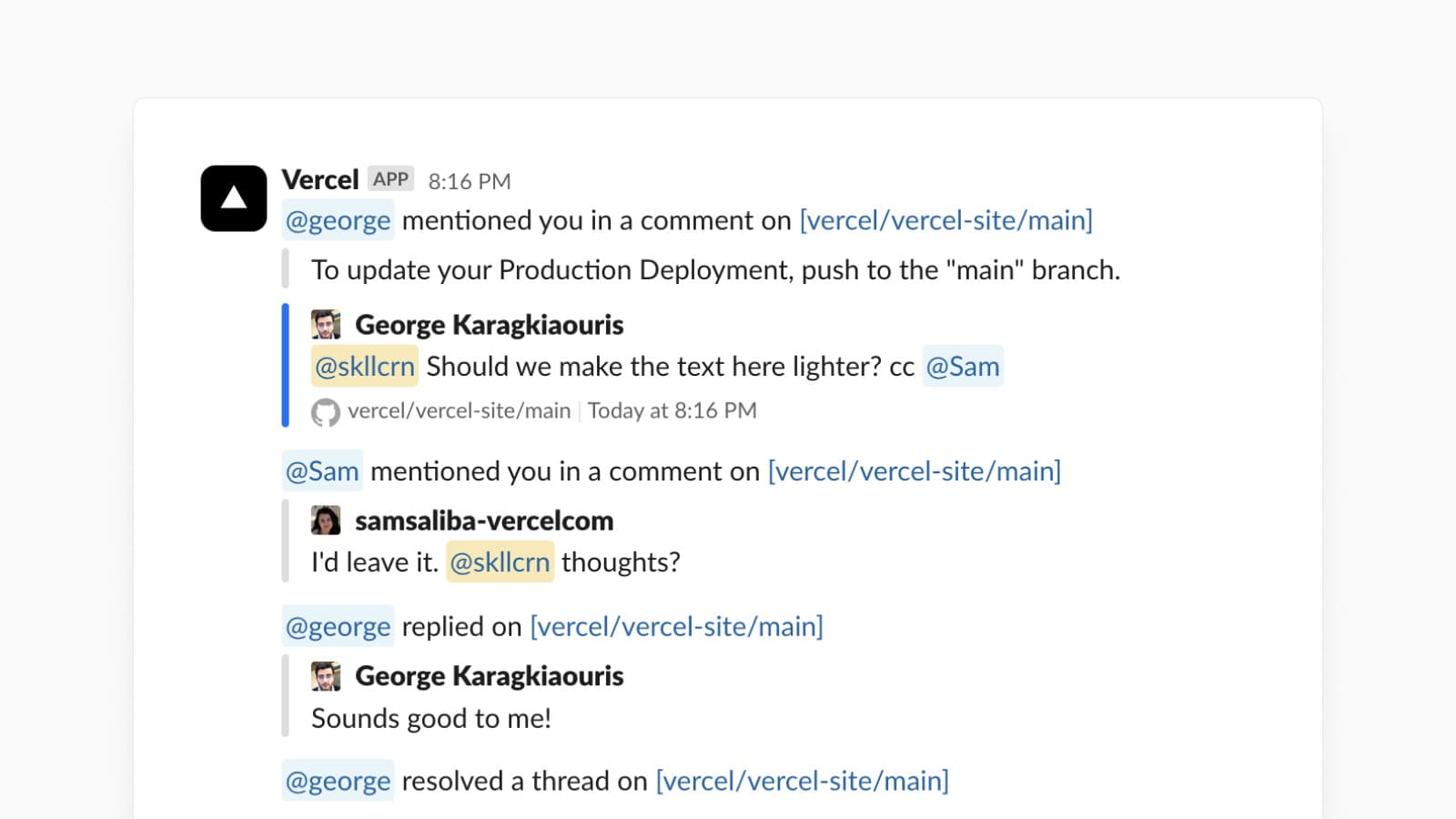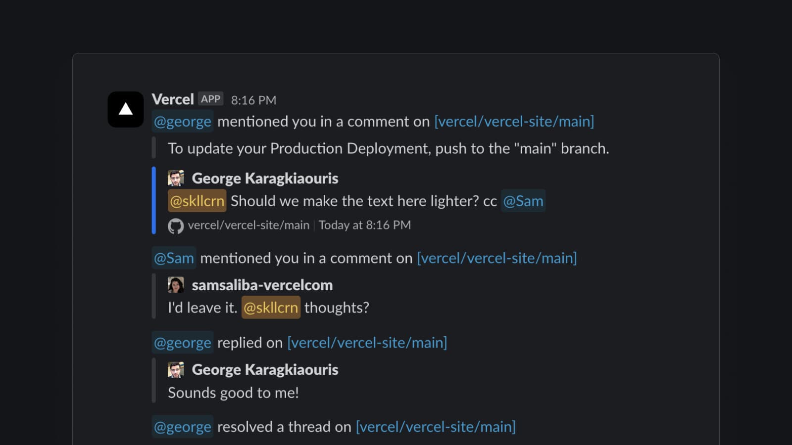 You will get a Slack message for each new Comment, and replies in Slack will automatically appear in the Comment thread on your deployment. You can also log in to the integration with your Vercel account to get DMs about comments relevant to you.