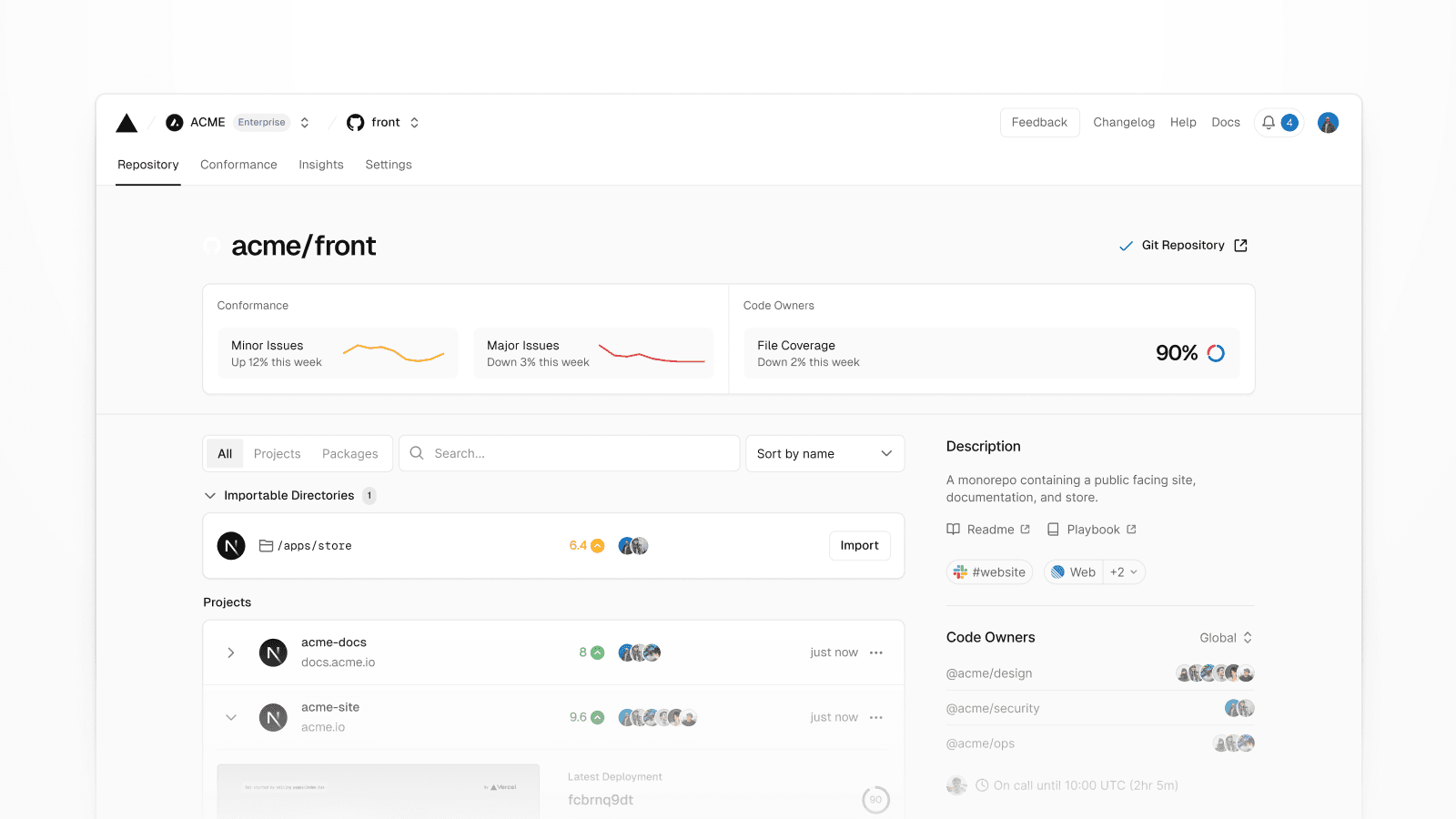 A reimagined dashboard experience: When you start using Conformance, you’ll see a reengineered workspace to surface code health insights, aid cross-team collaboration, and ensure a better onboarding experience for new team members.