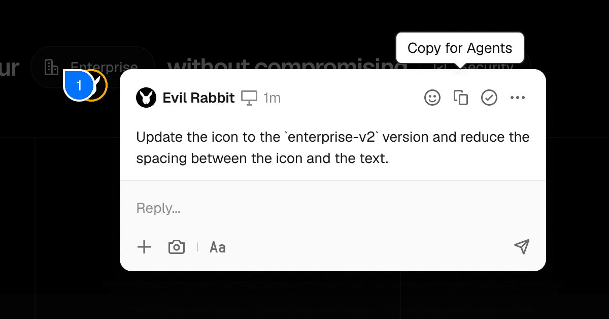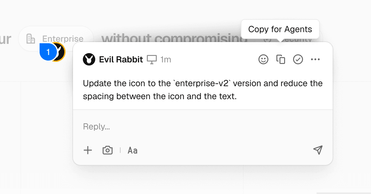 When teams copy comments using this feature, agents receive structured context including page URL and viewport dimensions, selected text and node path information, React component tree details, and the original comment text. This helps agents understand exactly where issues occur in your deployed application and what changes are needed.
