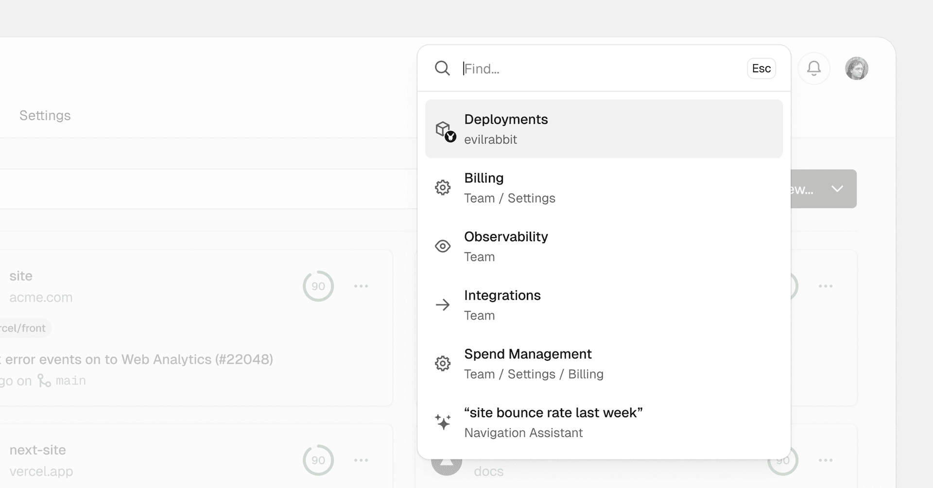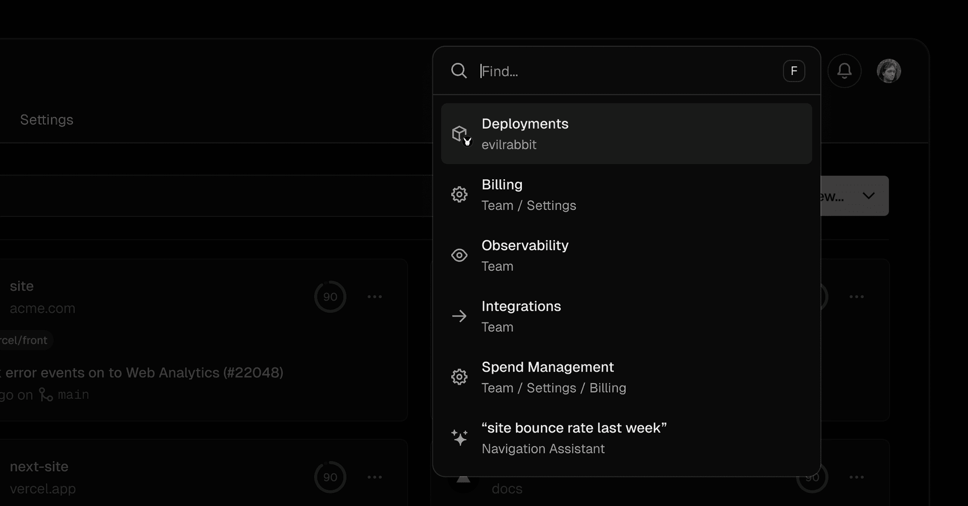 There is now a search feature in the top right corner of every page in the vercel.com dashboard.