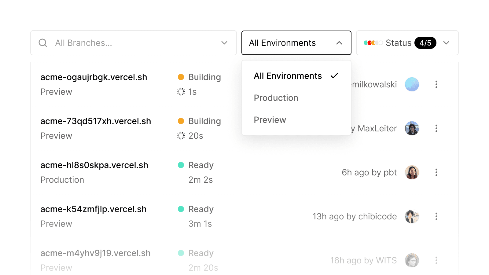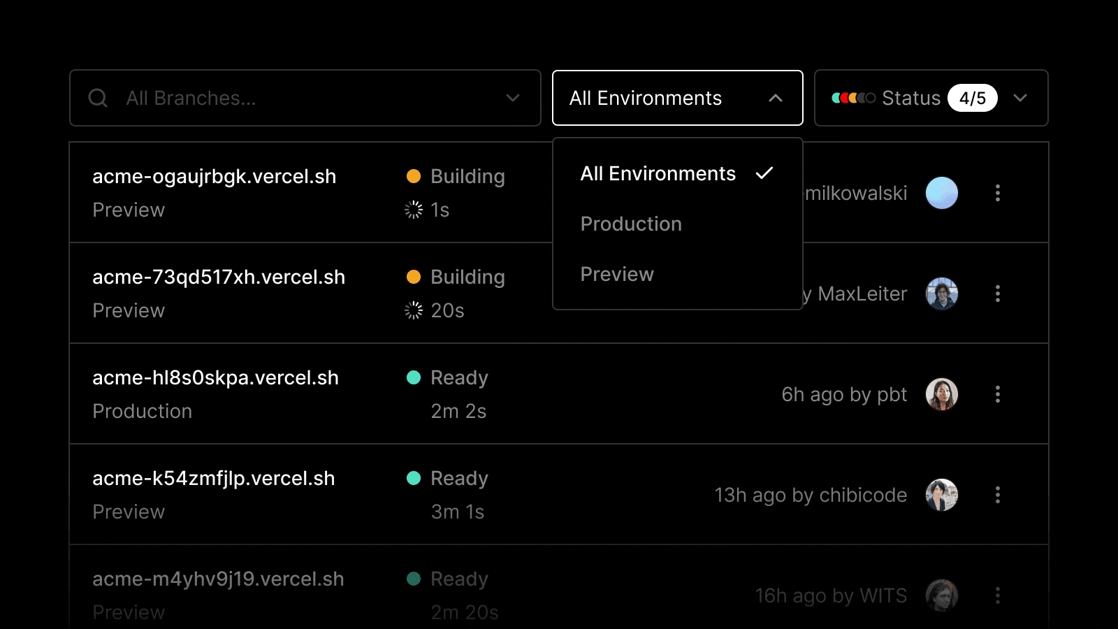 You can now filter your Deployments on Vercel by their environment type in addition to filtering by branches, making it easier to navigate to your production and/or preview deployments.