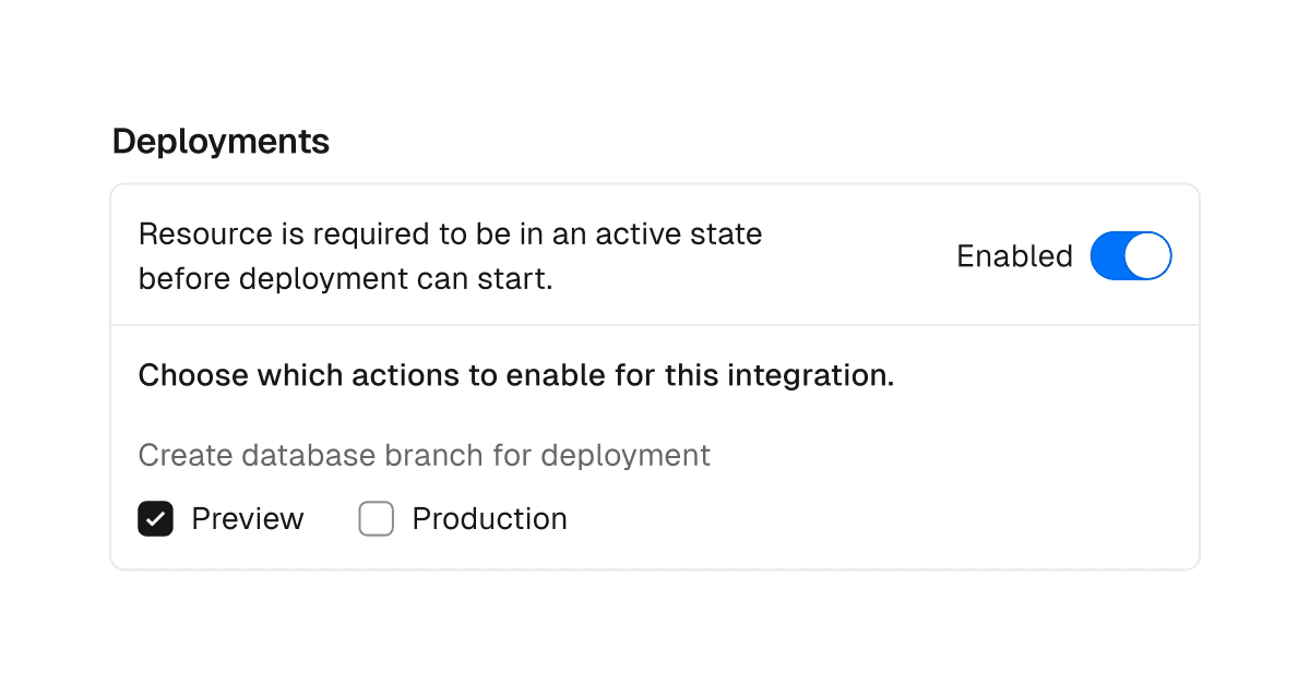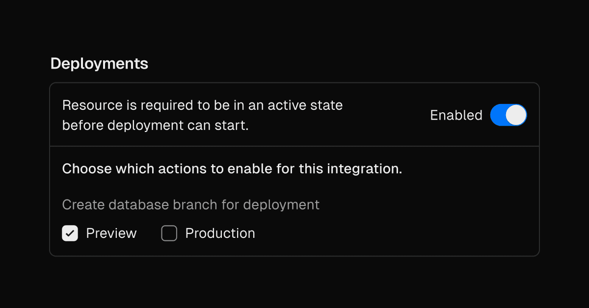 Marketplace integration providers can now register integration actions for deployments, allowing for automated resource-side tasks such as database branching, environment variable overrides, and readiness checks.