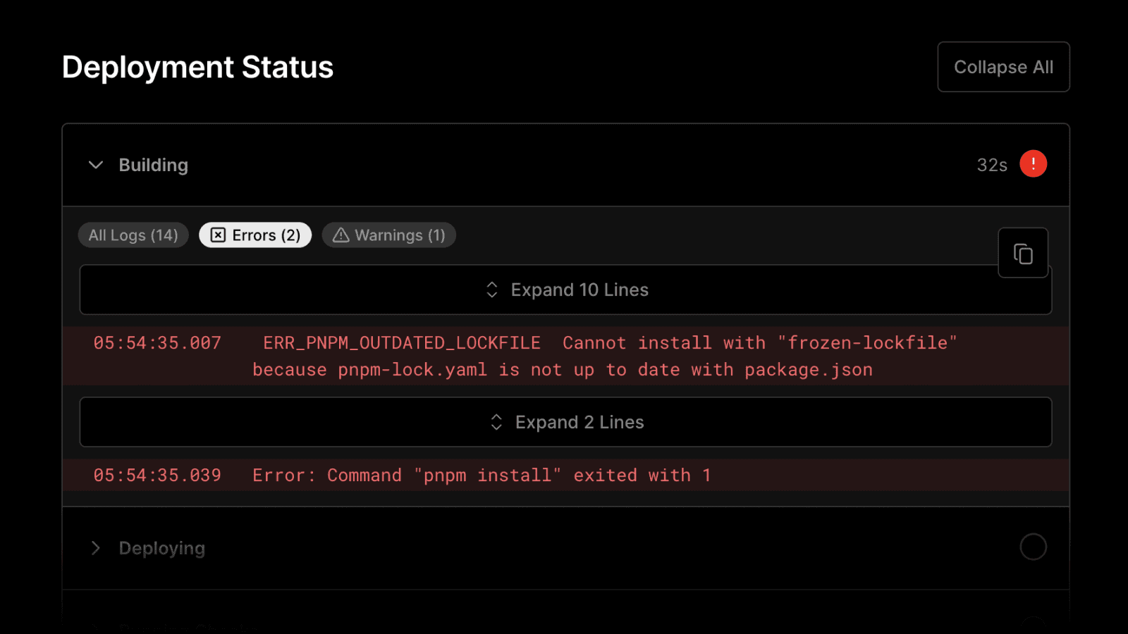 You can now apply filters to your deployment logs. For failed builds, the logs will automatically filter to errors. The heuristics used to detect error and warning logs have also been improved.