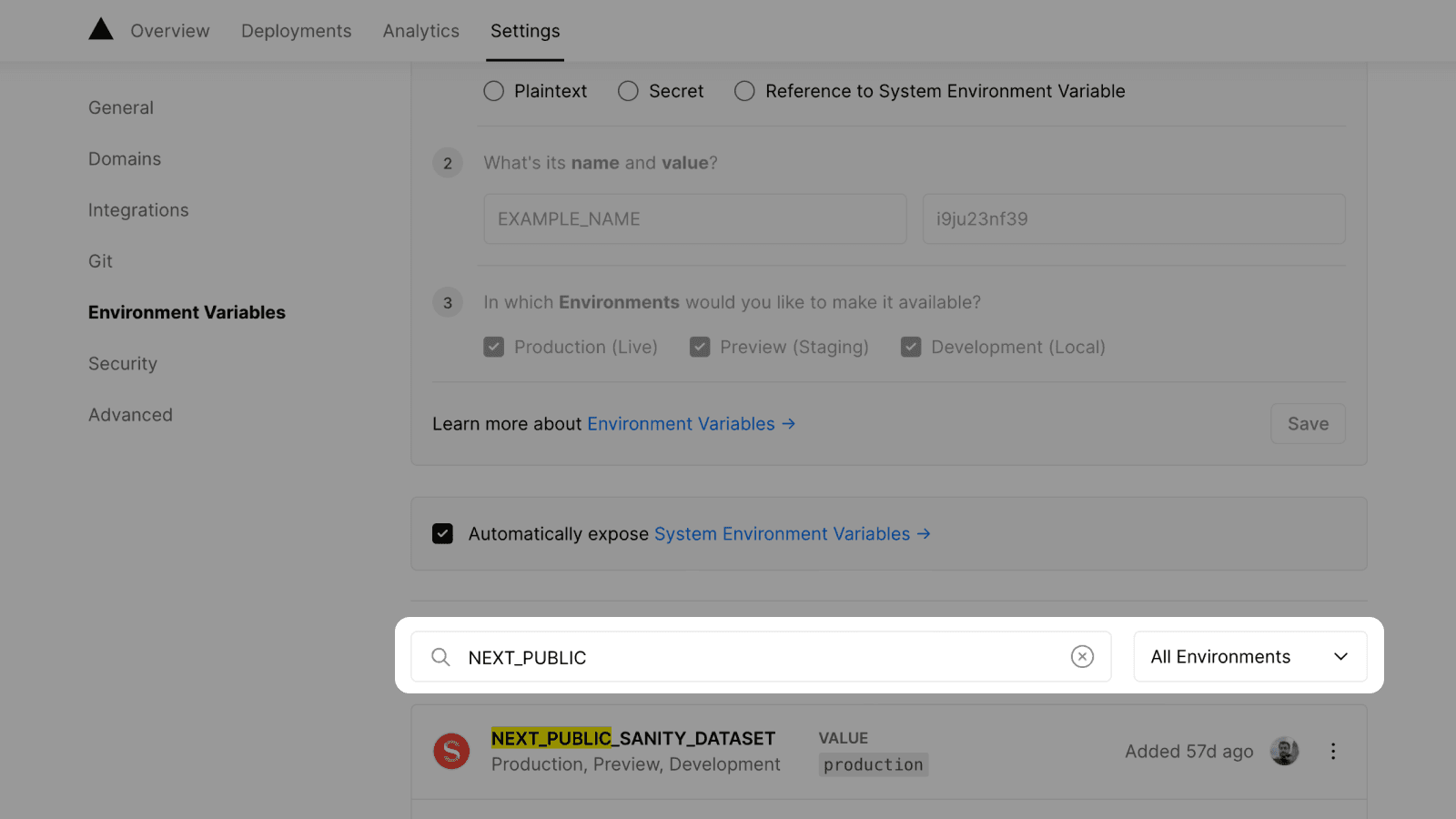 In order to make it easy for you to still only view the Environment Variables you're interested in, we just added a new search field and a select field on the right that lets you filter the Environment Variables down to a specific Environment.