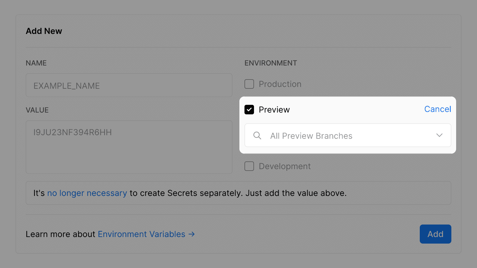 You can now add Environment Variables to a specific Git branch in the Preview Environment.