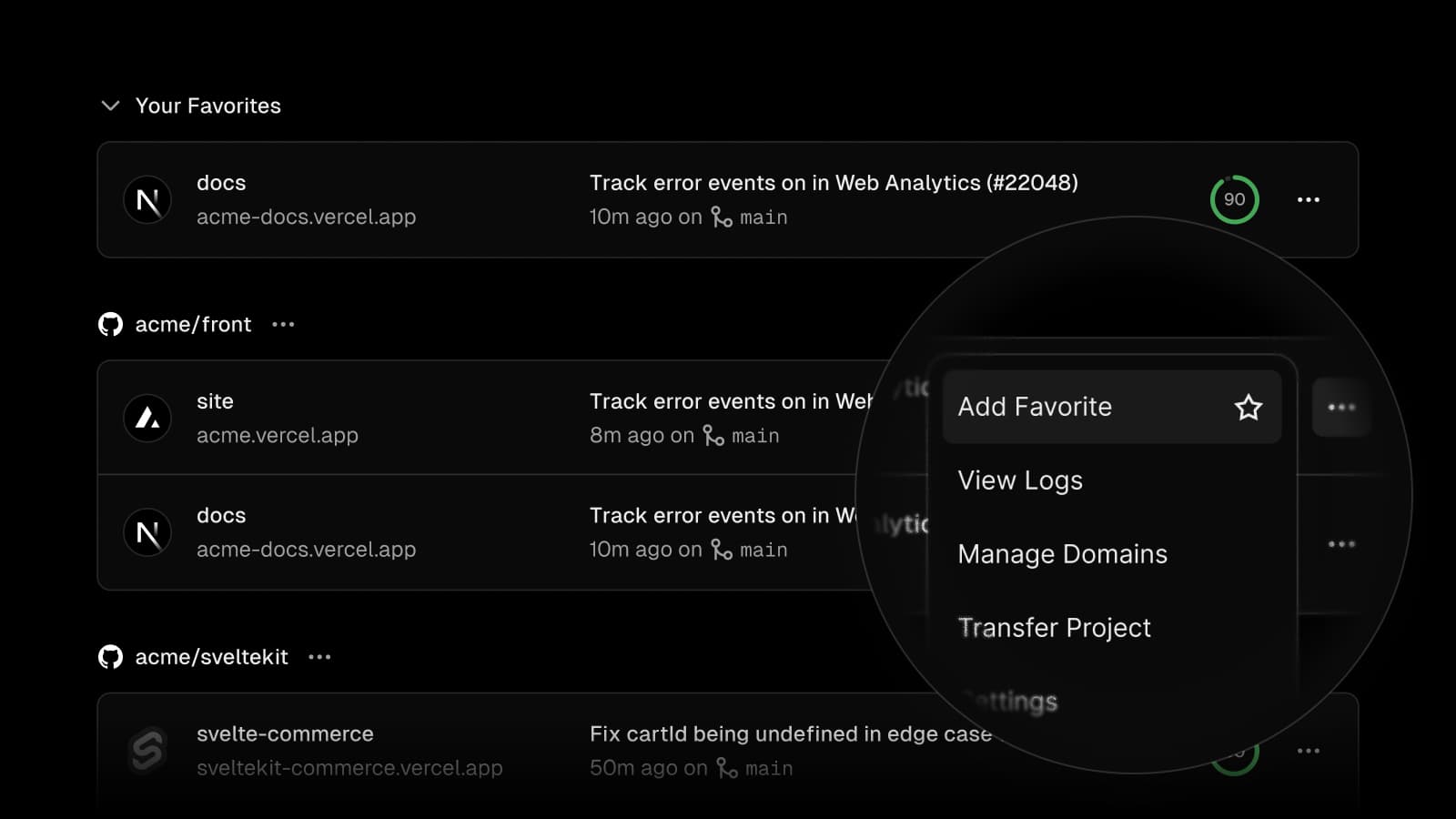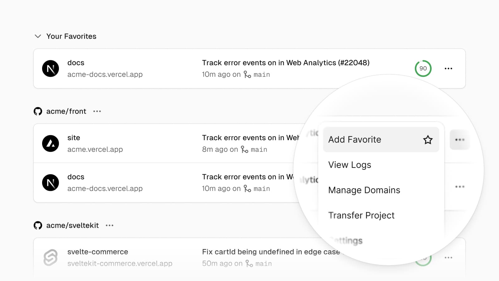 We recently introduced an improved project and team switcher on Vercel, including the option to favorite projects.