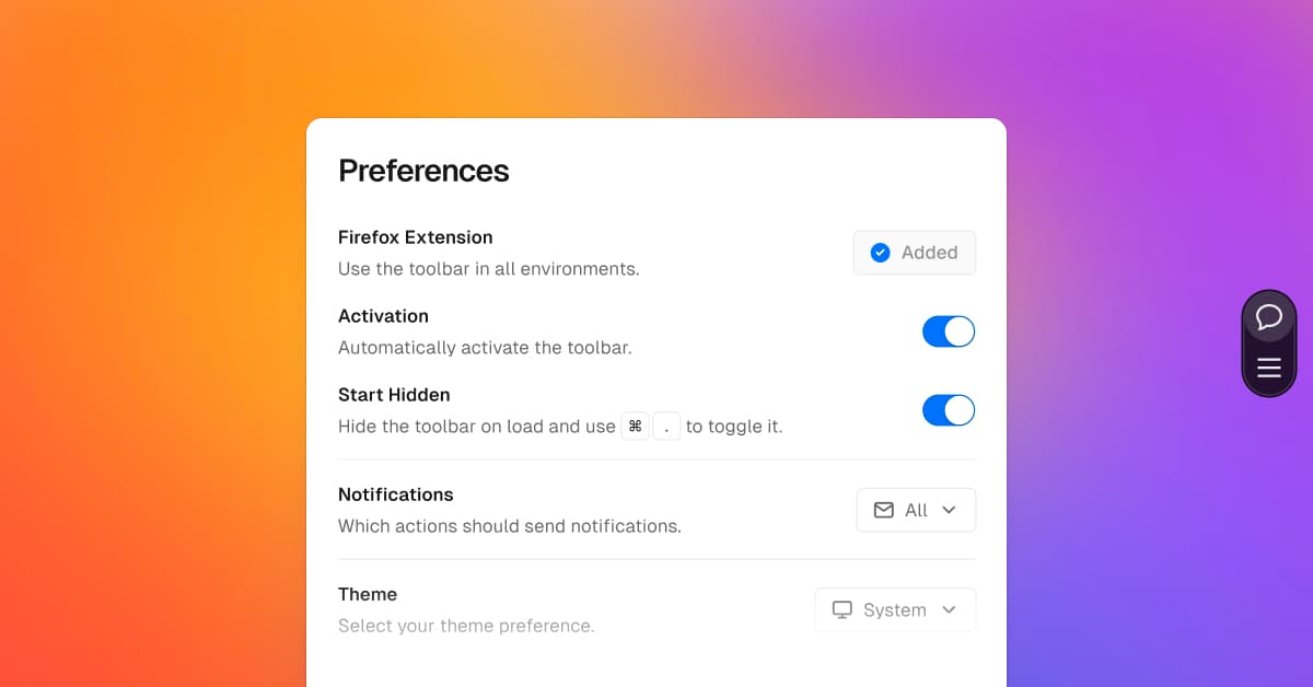 Install the Firefox extension from the Firefox Browser Add Ons page to get started or visit our documentation to learn more about the Vercel Toolbar and browser extensions.
