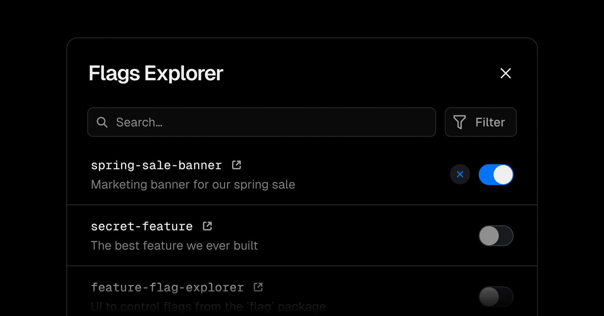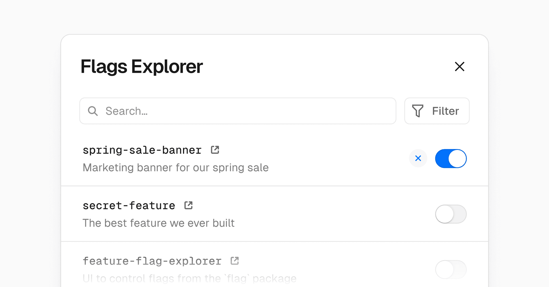 The Flags Explorer lets you override feature flags for your own session, without affecting colleagues, and without signing into your flag provider. This enables you to test features in production before they go live and keeps you in the flow.