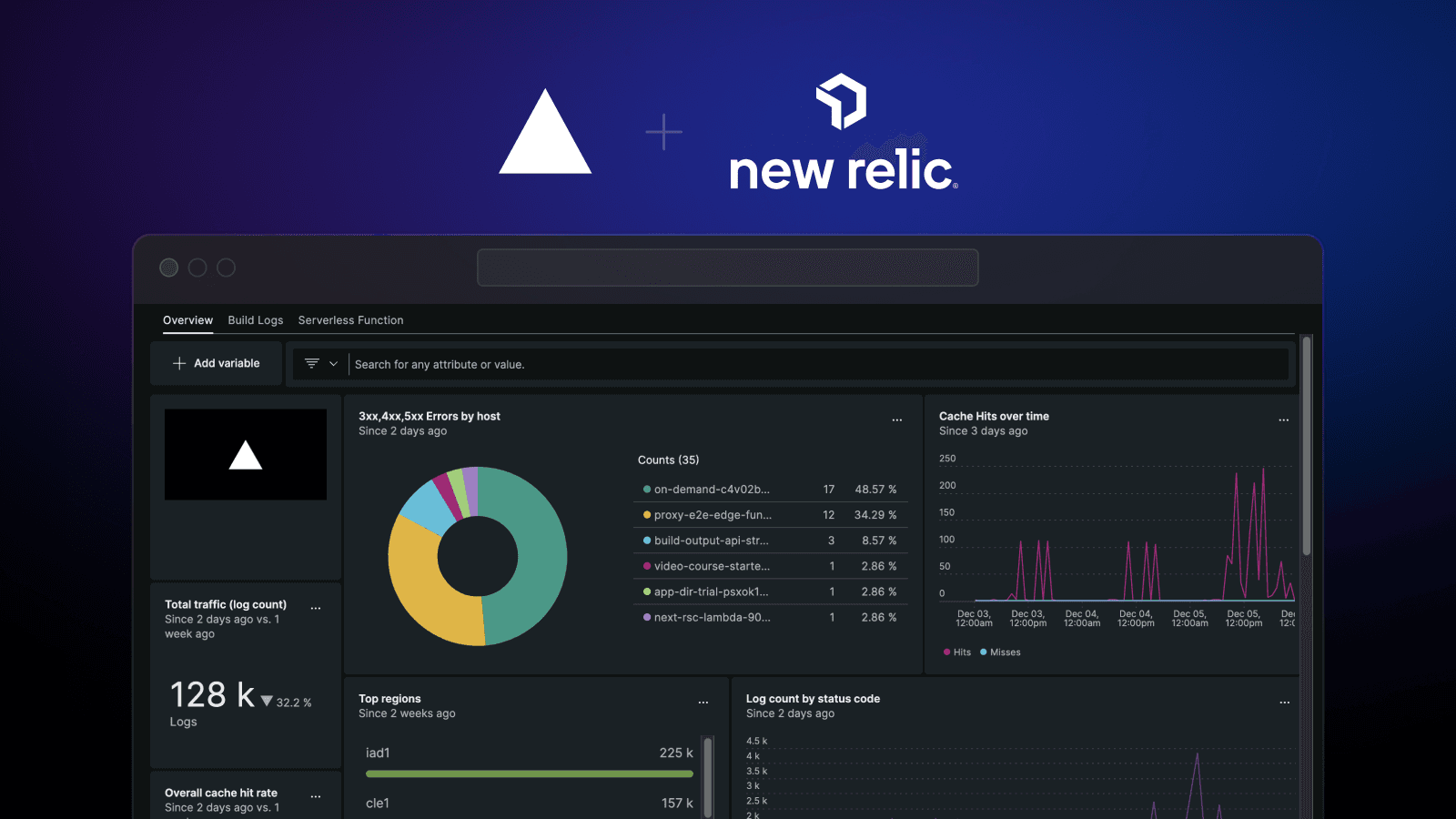 With the integration, you can stream function, error, and build logs from your Vercel projects to a pre-built dashboard in New Relic. This allows you to observe key metrics like cache hit rate, 4xx and 5xx error log counts, and the performance of your Serverless Functions for rapid troubleshooting and optimization.