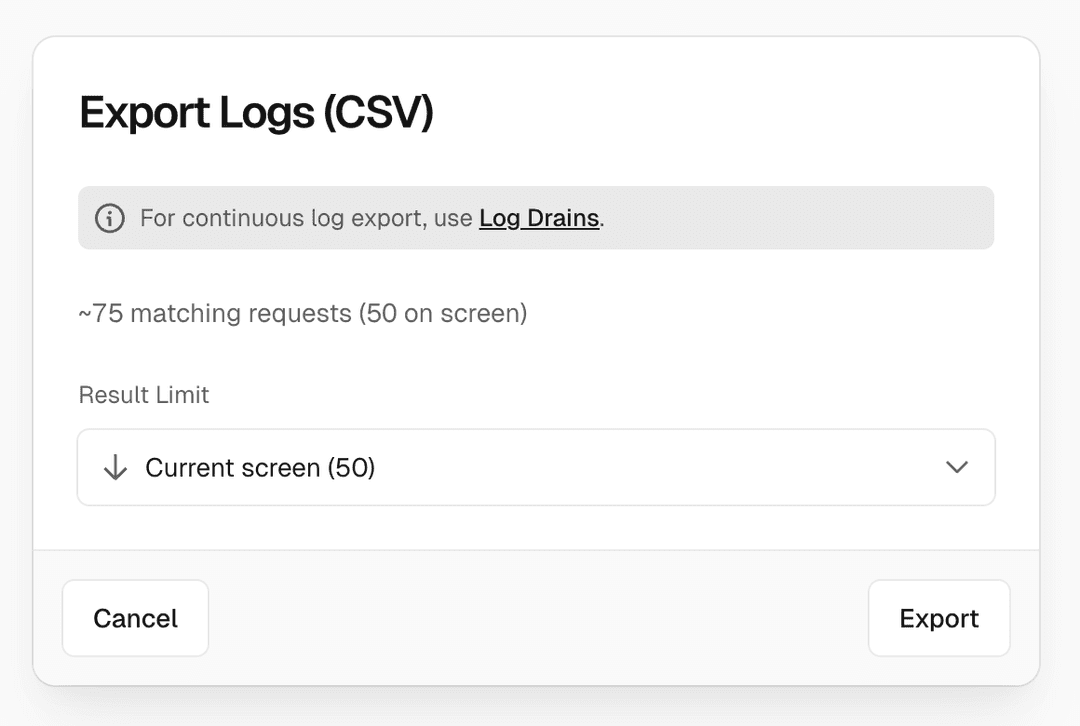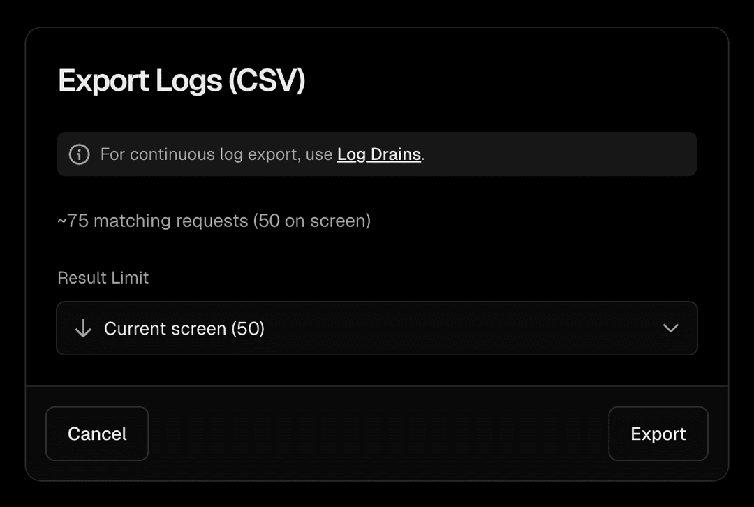 With runtime logs, you can view and export your logs. Exports now stream directly to the browser - your download starts immediately and you can continue to use the Vercel dashboard while the export runs in the background. This eliminates the need to wait for large files to buffer.
