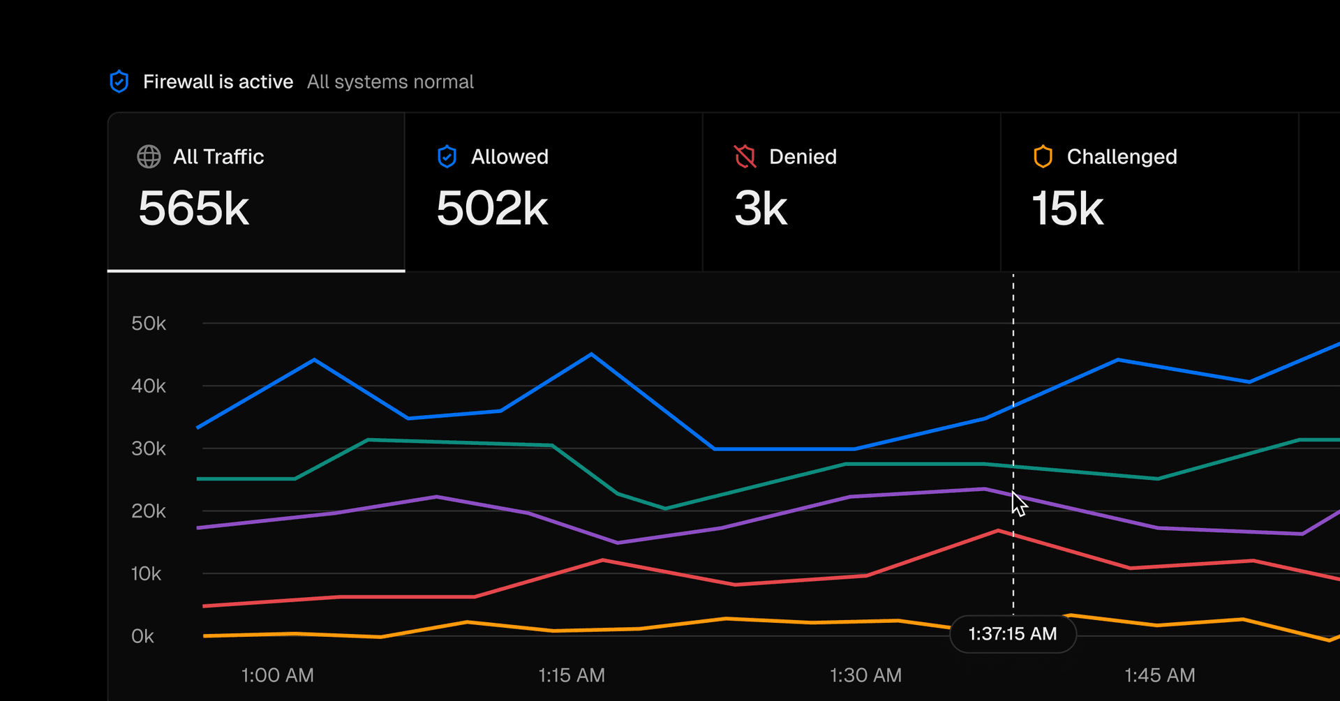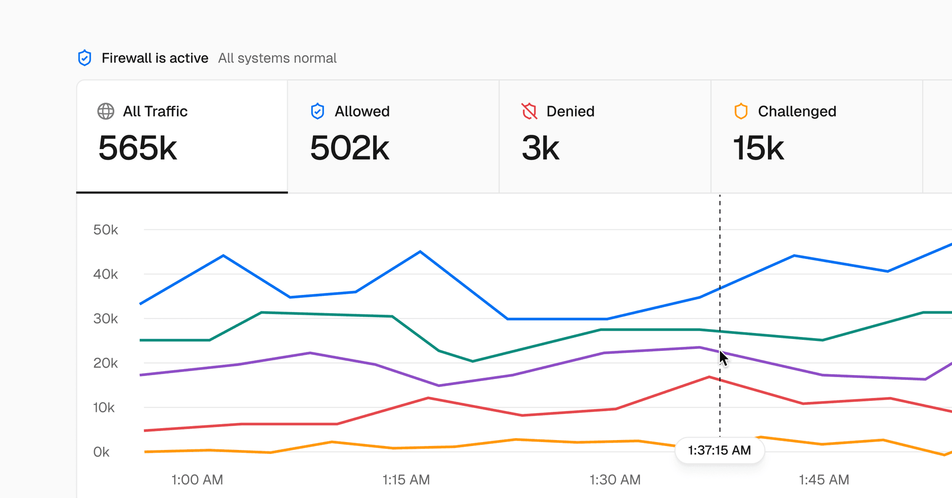 The Vercel Firewall overview page now shows improved visibility into your traffic and the Firewall status. Navigate to your Firewall page to see: