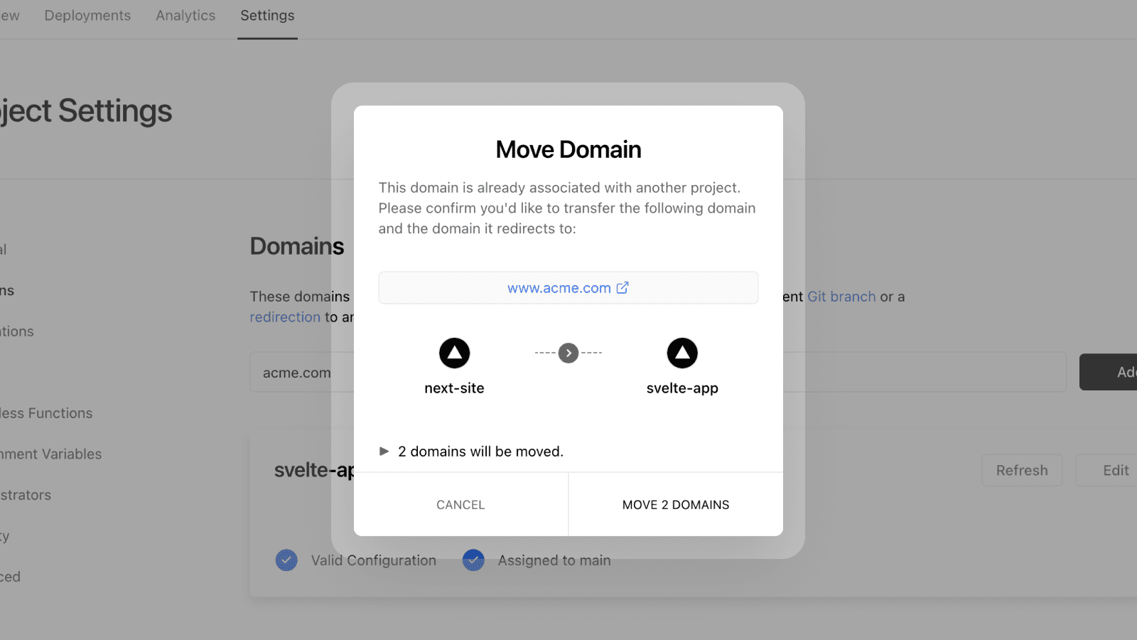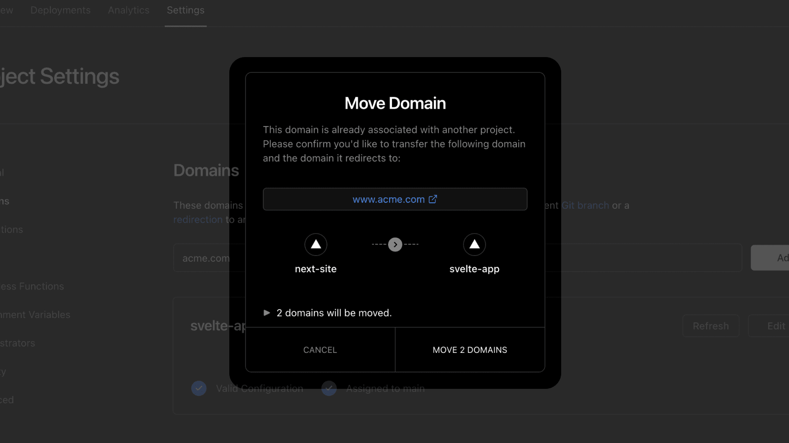 Previously, domains had to be removed from a project before being added to a new one. With this update, if you attempt to move a live domain to a new project, a prompt will appear offering to move the in-use domain and all associated redirects to the selected project.