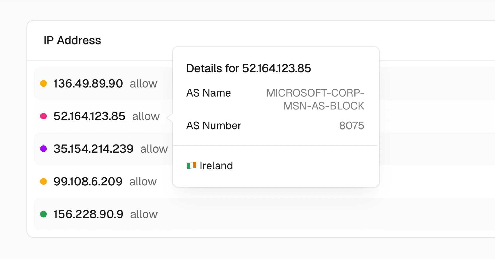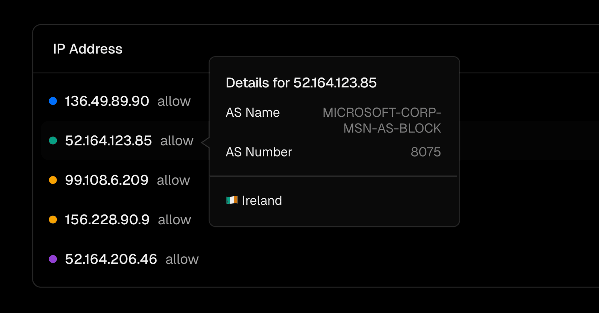 The Vercel Firewall dashboard now displays enriched IP address data, including the autonomous system (AS) name, AS number (ASN), and geolocation on hover.