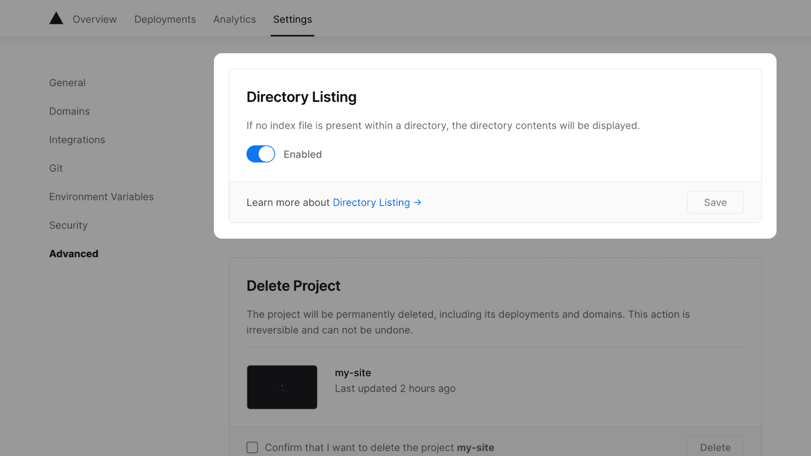 As of today, the Directory Listing is disabled for all newly created Projects and can be toggled on the "Advanced" page in the Project Settings.