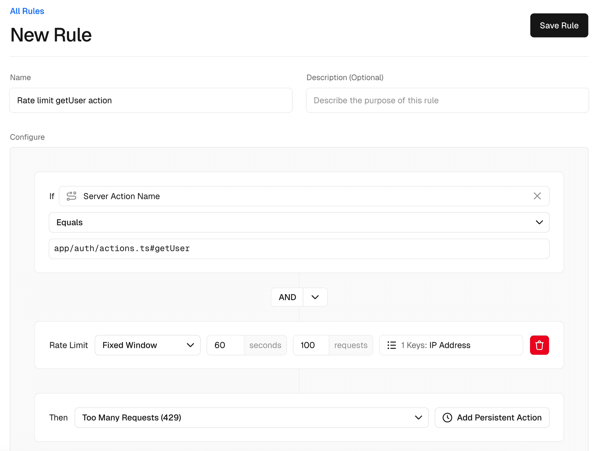Starting with Next.js 15.5, customers can now configure custom rules targeting specific server action names. In the example below, you can rate limit app/auth/actions.ts#getUser actions to 100 requests per minute per IP address.