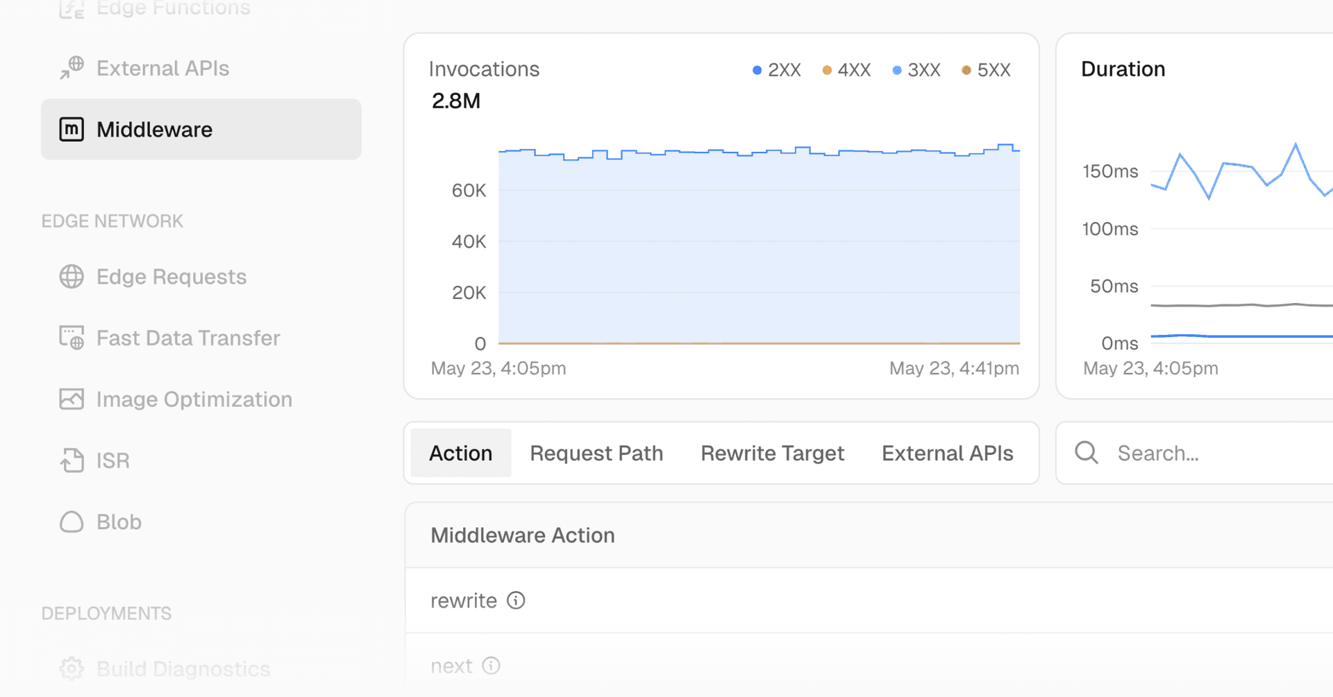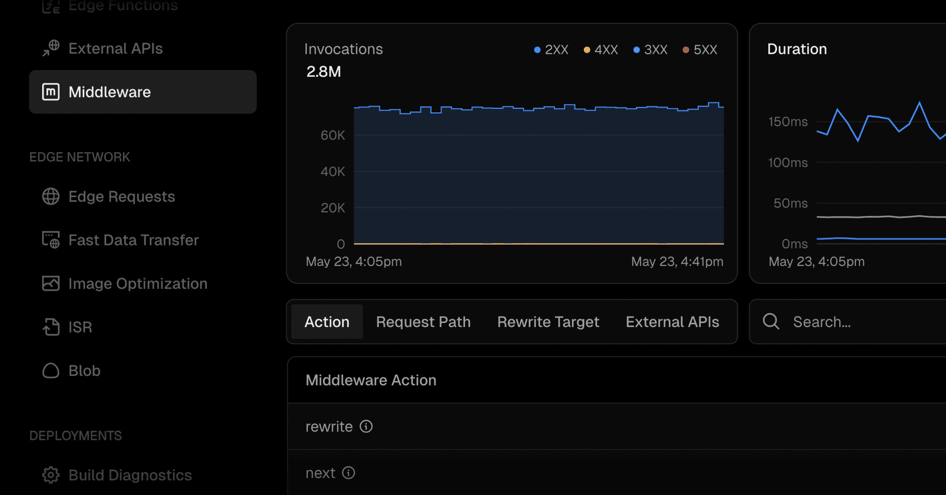 The Vercel Observability dashboard now includes a dedicated view for middleware, showing invocation counts and performance metrics.