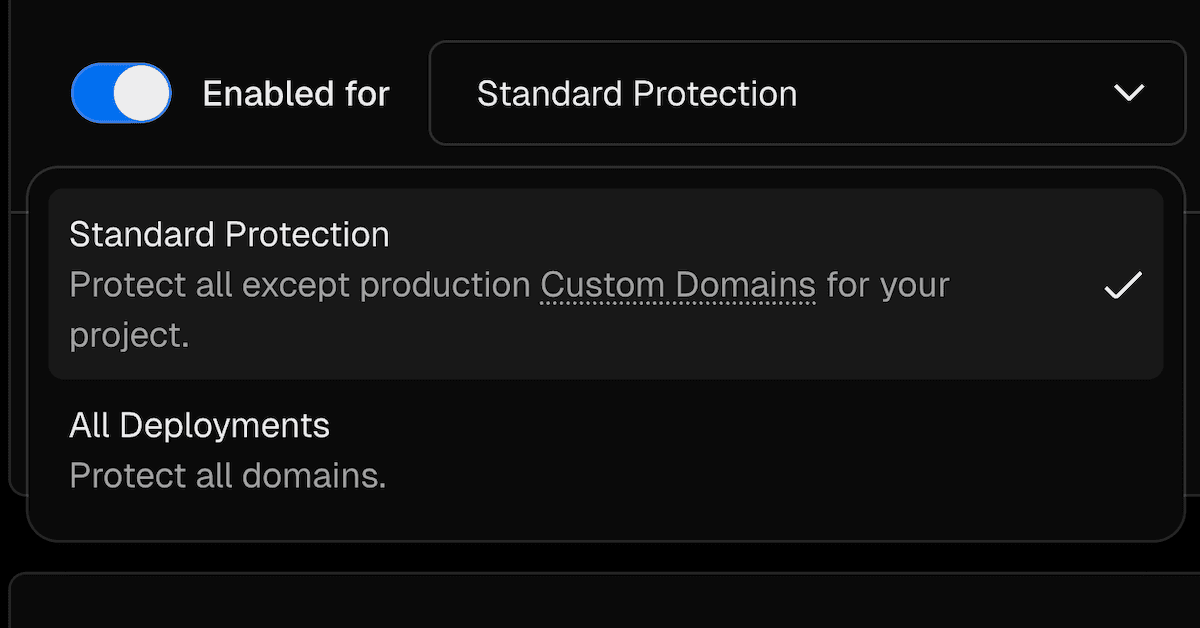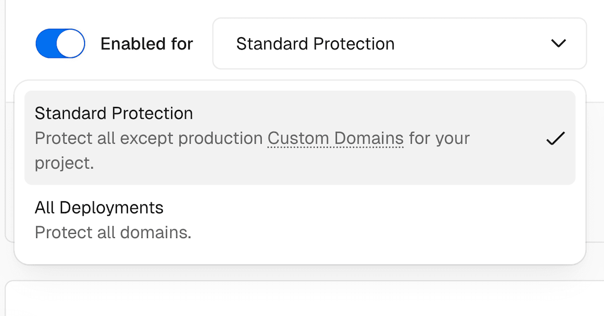 Deployment Protection safeguards preview and production URLs so that users can't access the domains that you don't want them to. Starting today, the Standard Deployment Protection option has been updated for new projects to protect all automatically generated domains, including the production branch git domain (for example project-git-main.vercel.app