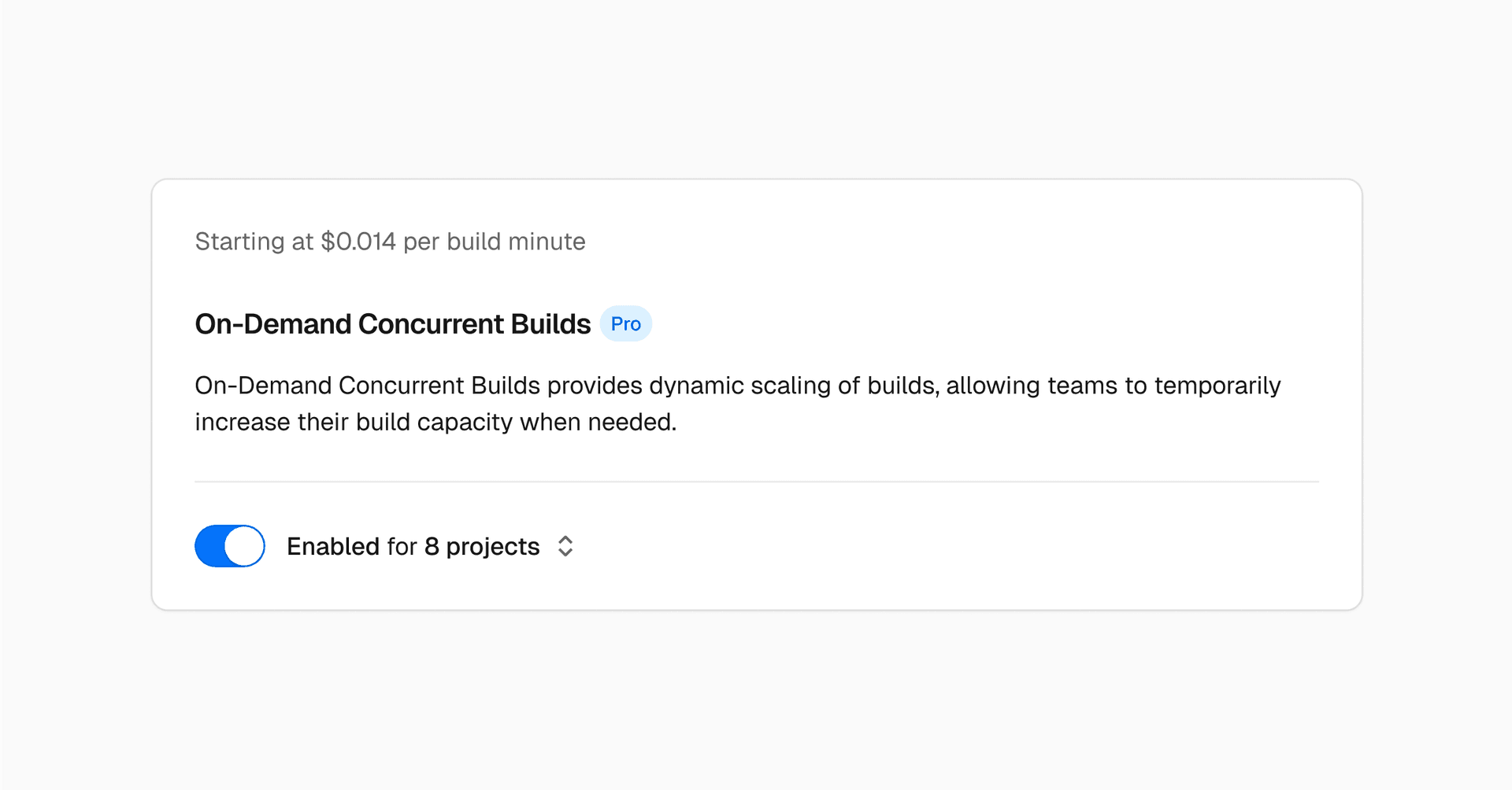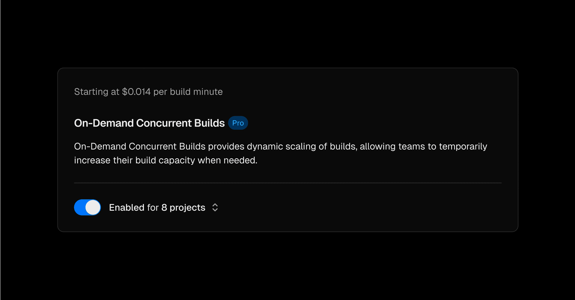Teams on the new Pro pricing model will now have on-demand concurrent builds enabled by default. This ensures builds across projects start immediately without waiting in a queue, except when multiple builds target the same Git branch.
