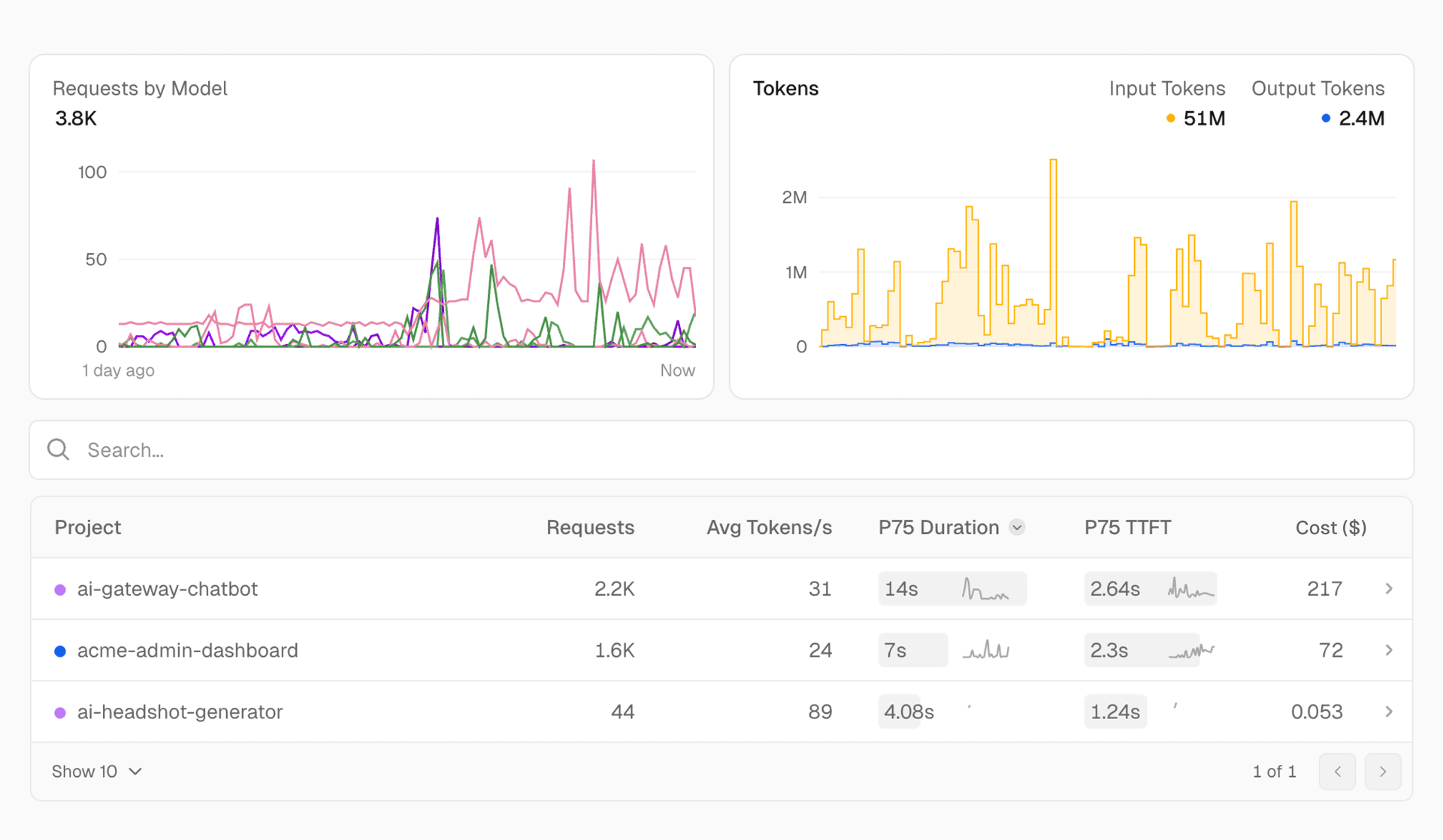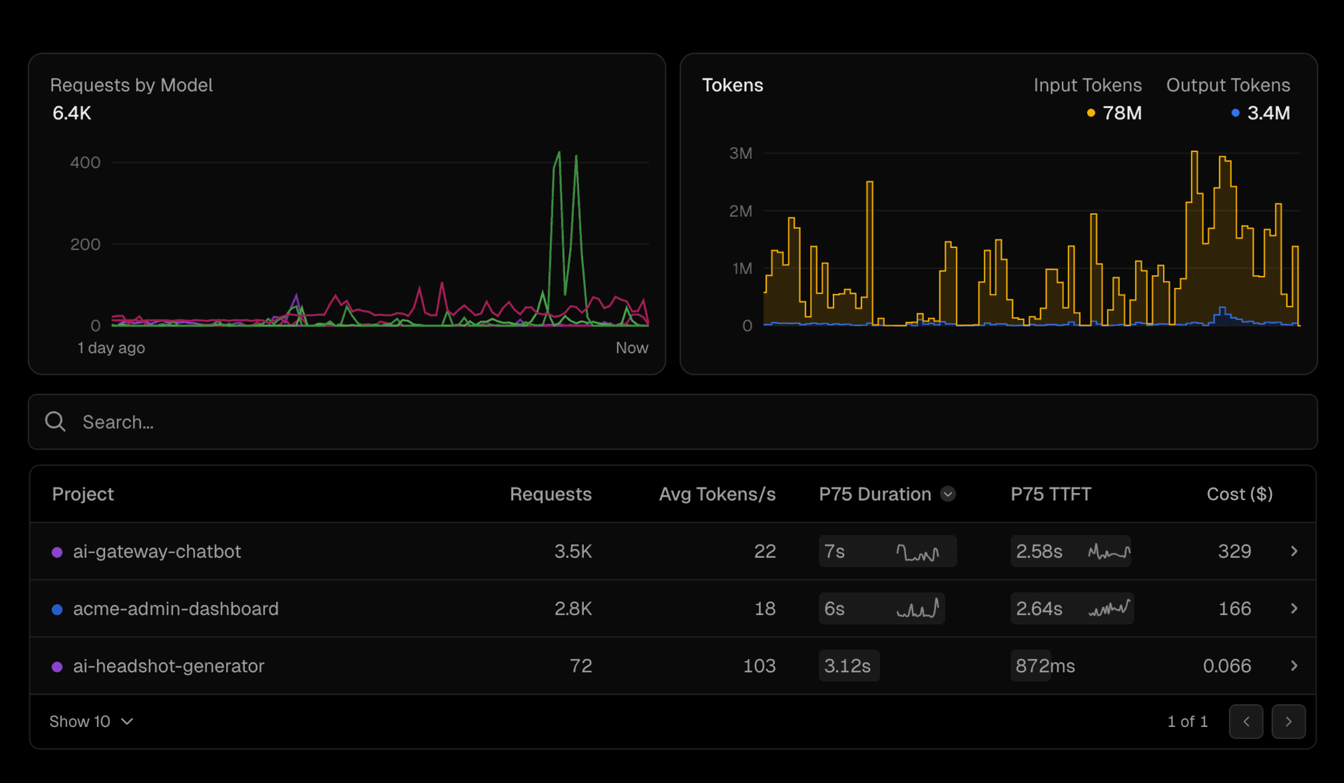 You can view these metrics across all projects or drill into per-project and per-model usage to understand which models are performing well, how they compare on latency, and what each request would cost in production.