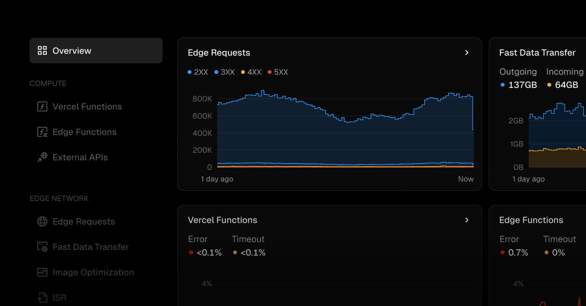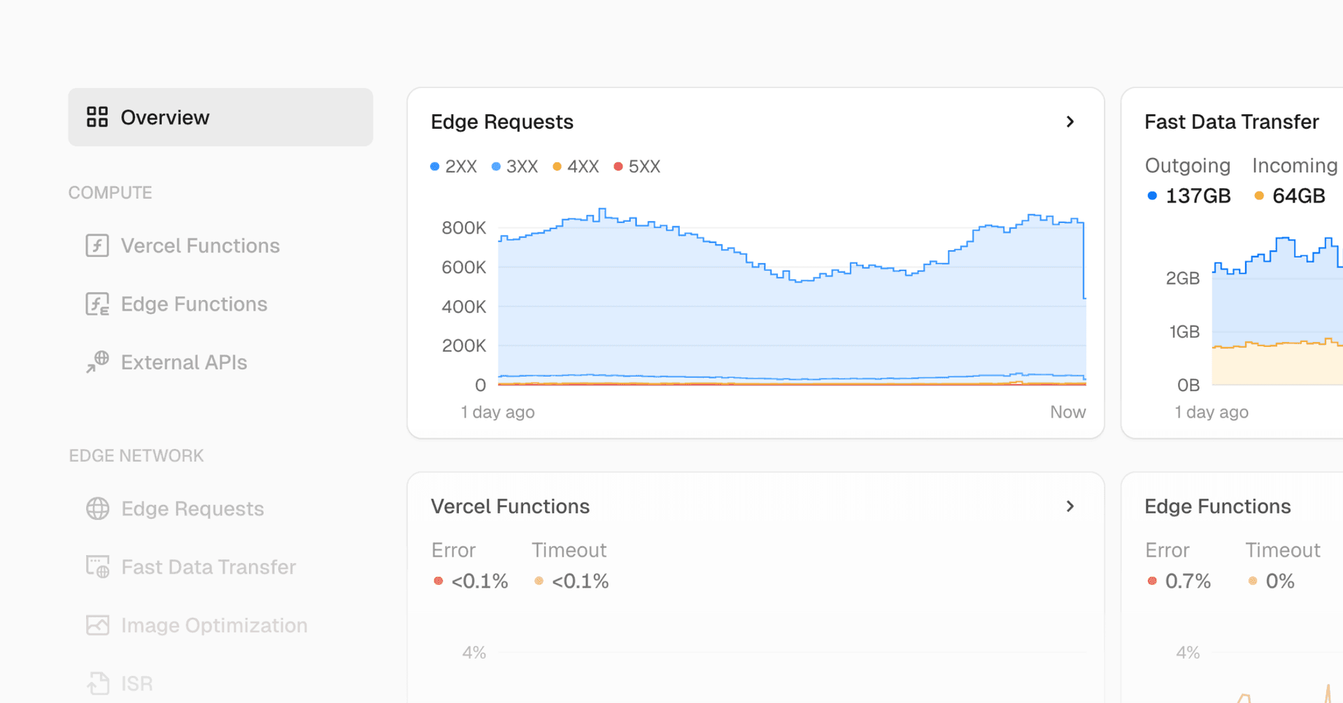 This new dashboard aggregates key metrics from Edge Requests, Fast Data Transfer, and Vercel Functions, giving you instant insights into request and data transfer volumes, as well as function performance.
