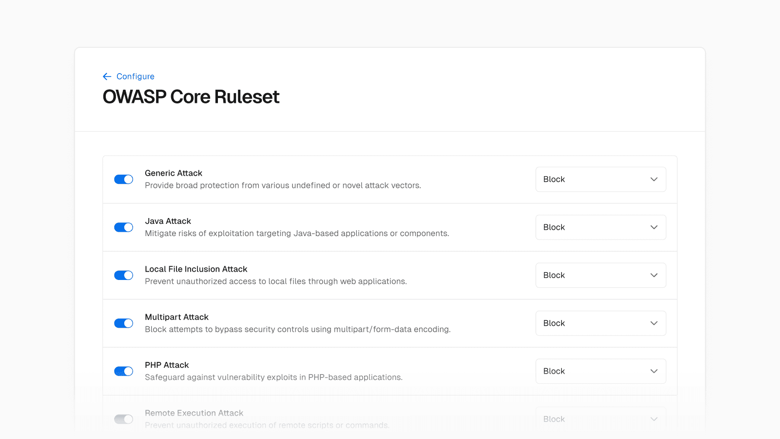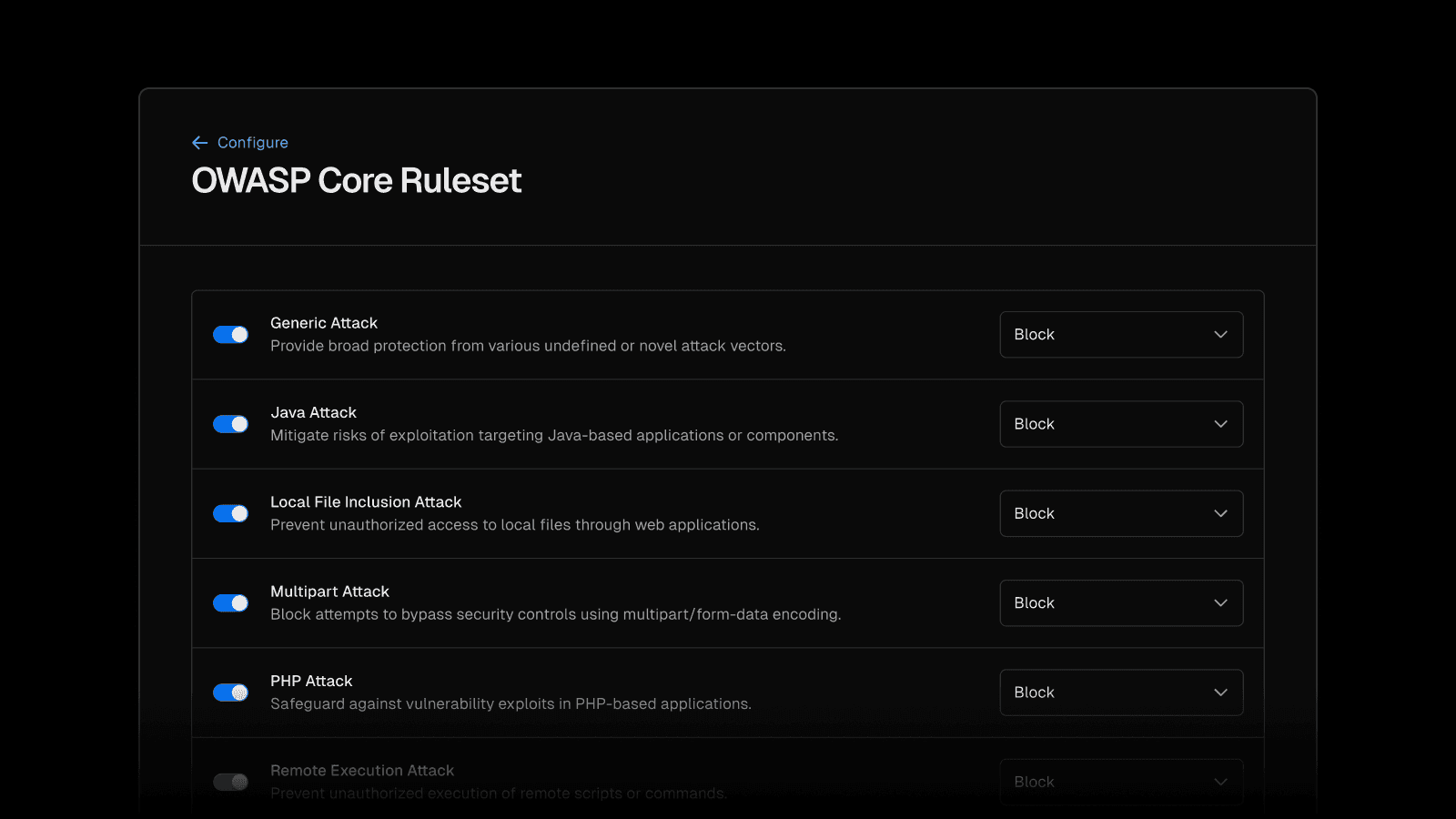 The Vercel Firewall protects against the OWASP Core Ruleset for Enterprise, which enables Vercel to log, block, or challenge traffic against these rules.