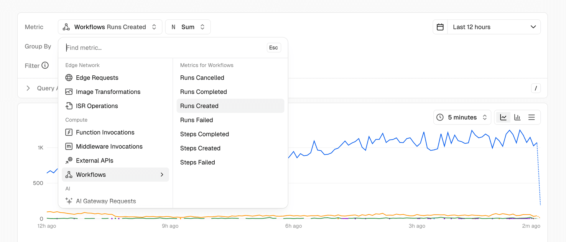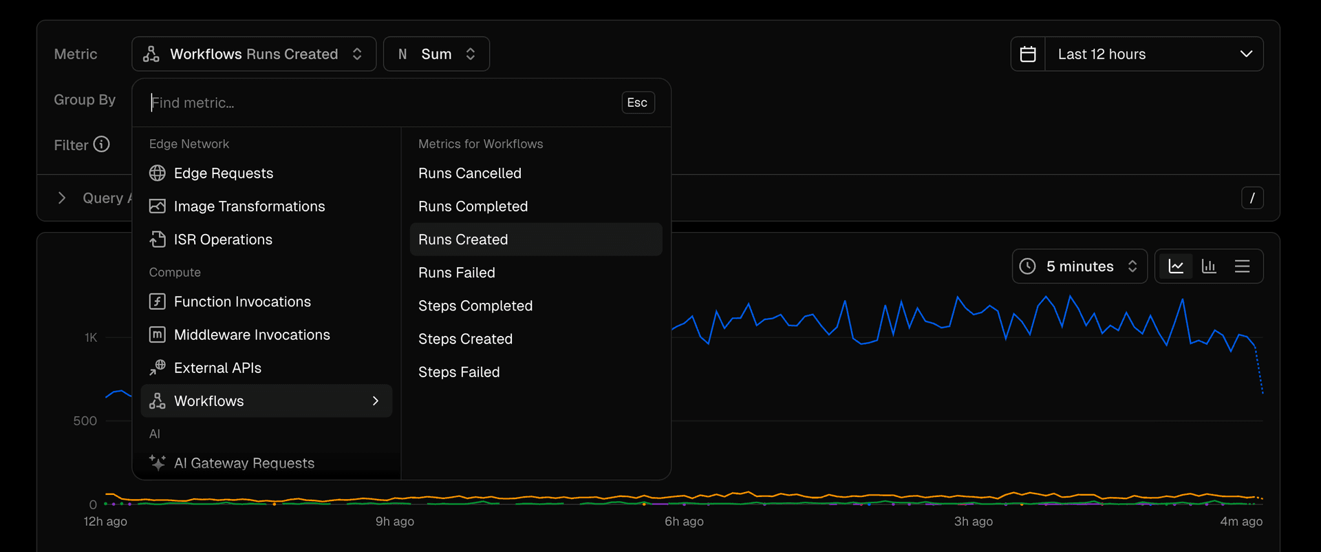 Observability Plus's query builder now lets you create custom queries on workflow runs and steps, visualizing traffic, performance, and other key metrics across Vercel Workflows.