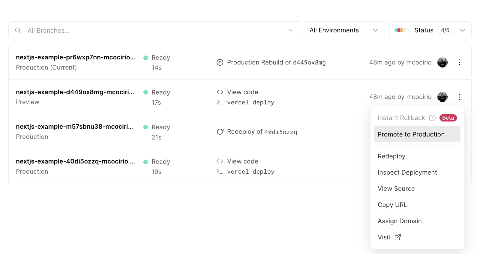 You can now redeploy or promote all deployments to production from the Vercel dashboard, no matter if you create them with the CLI or through the Git integration.