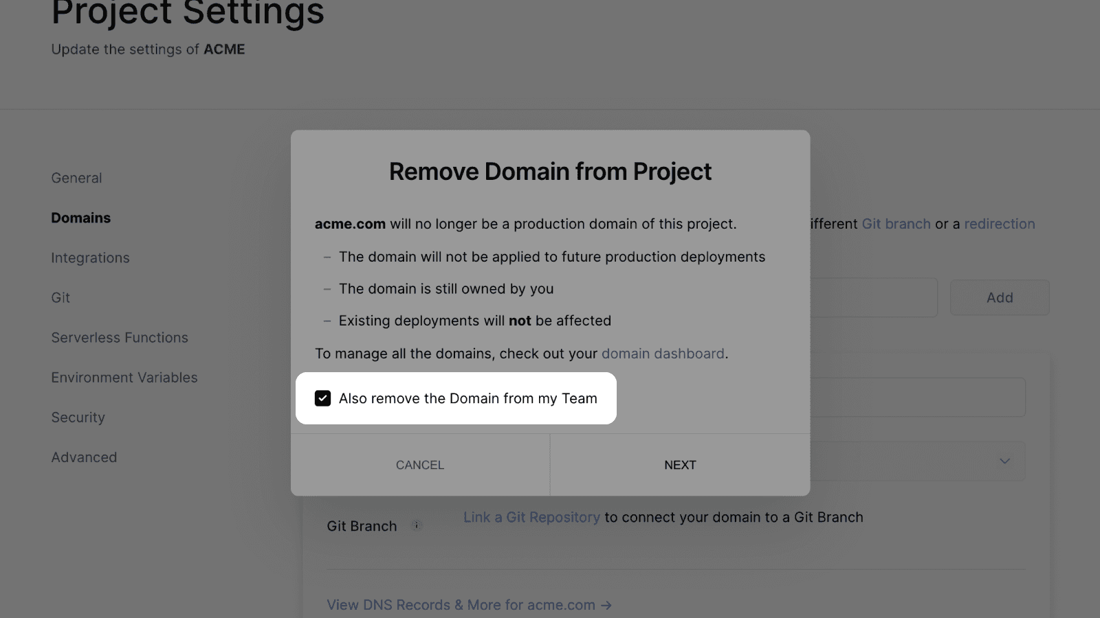 Starting today, removing Domains in the Project Settings now also optionally removes them globally, for all other Projects on your Personal Account or Team.