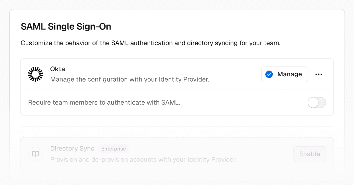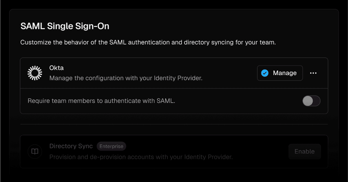SAML-based Single Sign-On (SAML SSO) is now available as an add-on to all Pro teams and can be configured directly in the dashboard. This includes support for major identity providers like Okta, Azure AD, and Google Workspace.