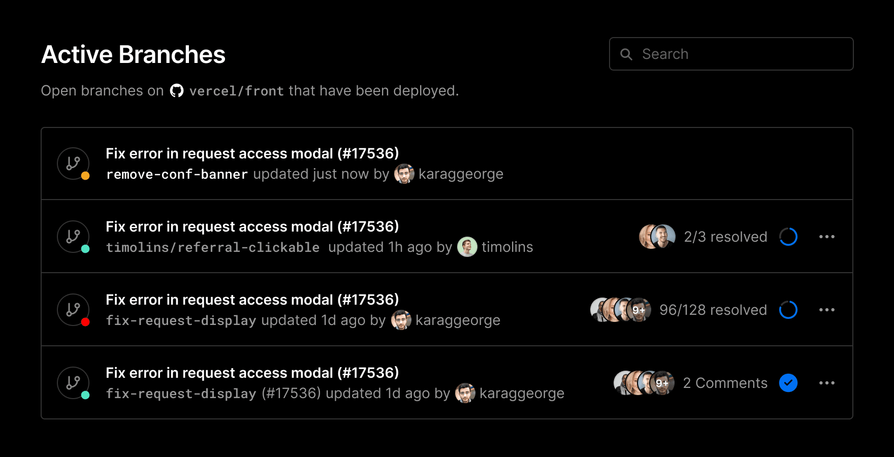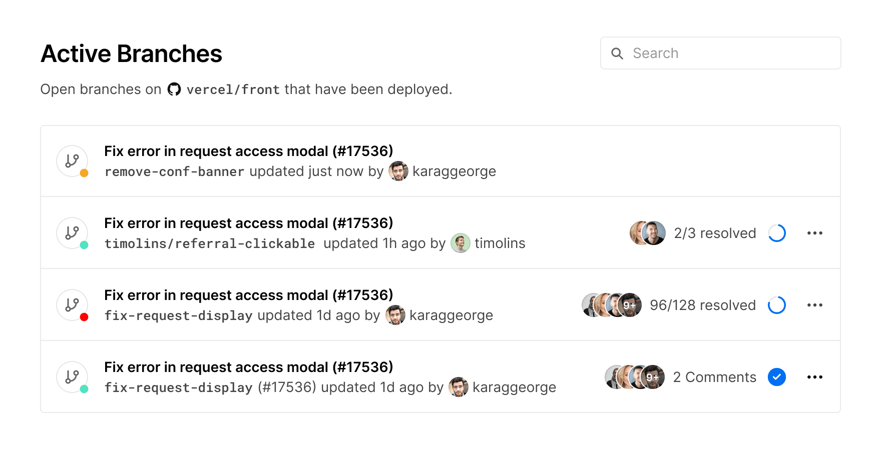 The Active Branches view for Deployments has an updated design which is now filtered on open branches with deployments. This update allows you to access your work in progress, surfaces useful data including deployment status and comments metadata, and also gives you a quick link to your Preview Deployment.