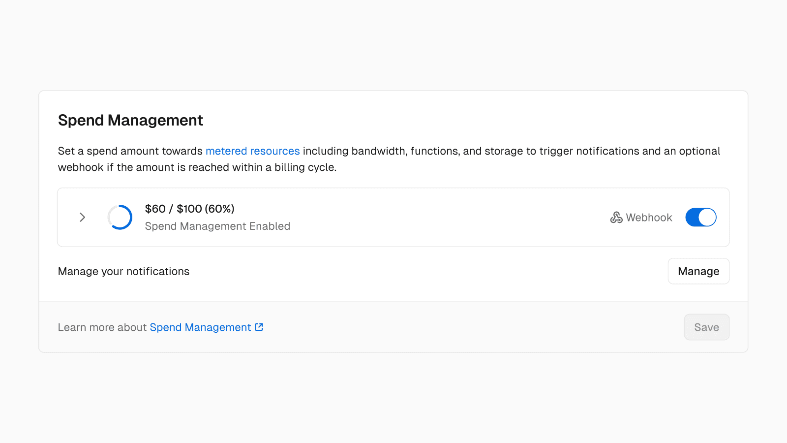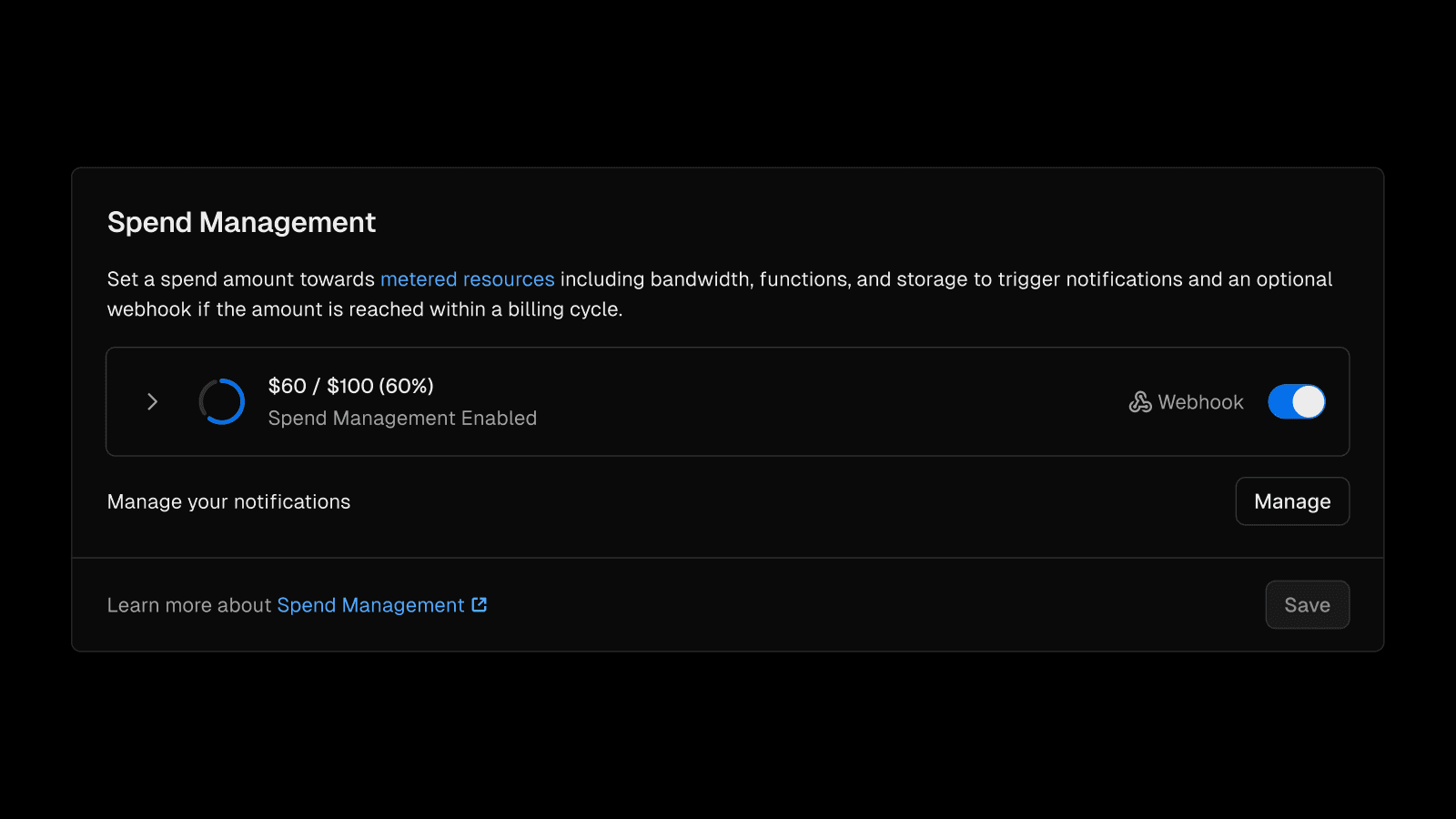Today, we'll begin rolling out Spend management on the Pro plan for the Billing and Owner roles. You can recieve notifications and trigger webhooks when you pass a given spend amount on metered resources like Functions. The actions you can take are: