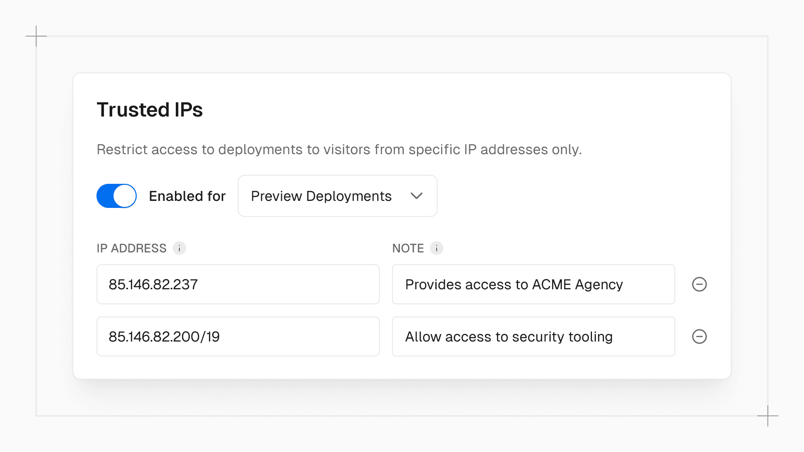 Trusted IPs are a feature of Deployment Protection that allow you to limit access to your deployments by IP address. Configure Trusted IPs in addition to Vercel Authentication to ensure only your team members can access and make changes to your deployments.
