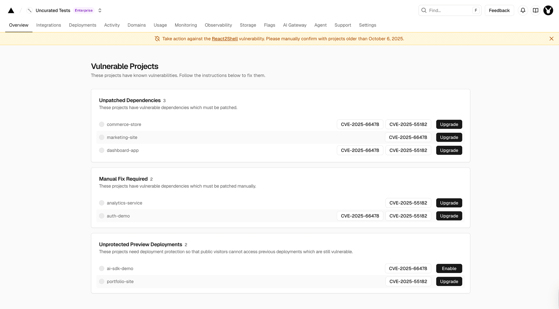 Vercel now provides a unified dashboard that surfaces any security issues requiring action from your team. When a critical vulnerability or security-related task is detected, the dashboard automatically groups your affected projects and guides you through the steps needed to secure them.