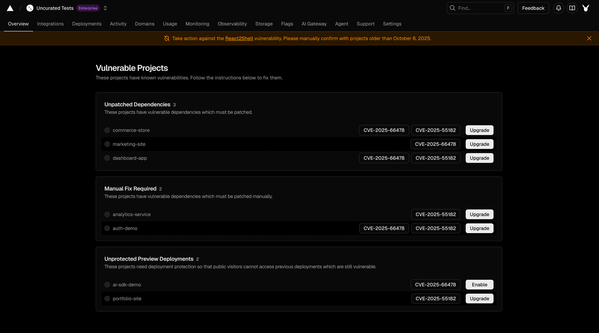 Automatic detection of security vulnerabilities that require user intervention - When the platform identifies a vulnerability or configuration that cannot be fully mitigated by Vercel’s autonomous protections, it’s surfaced here with clear instructions.