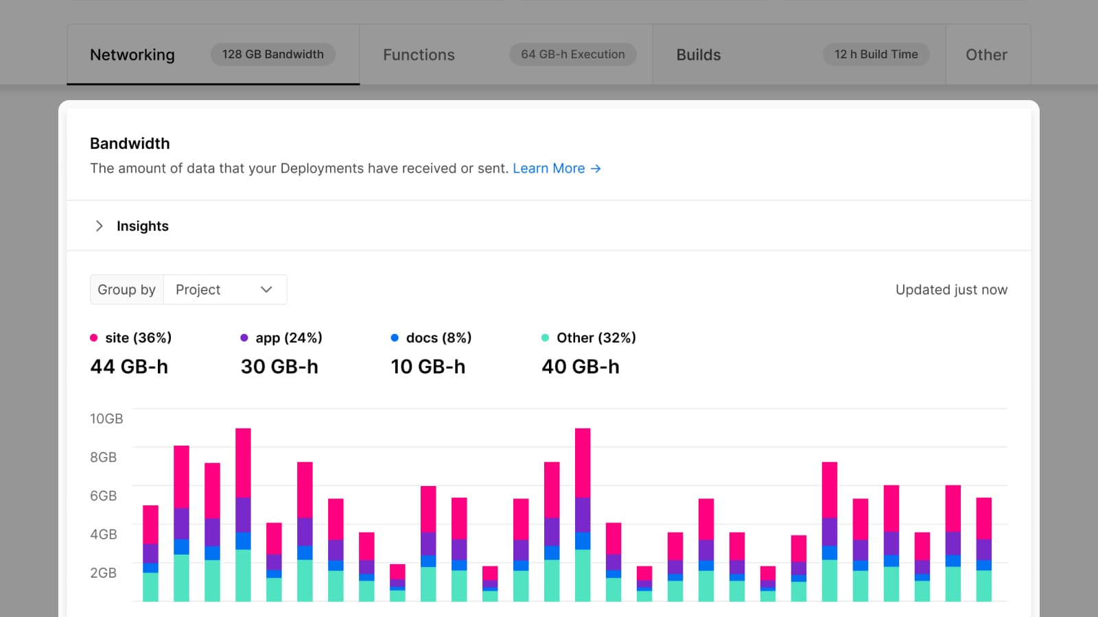 To help provide better insight into your accounts resource usage, the Usage Overview now gives you the ability to view data grouped by your top 4 projects, in addition to grouping the charts by count or ratio.