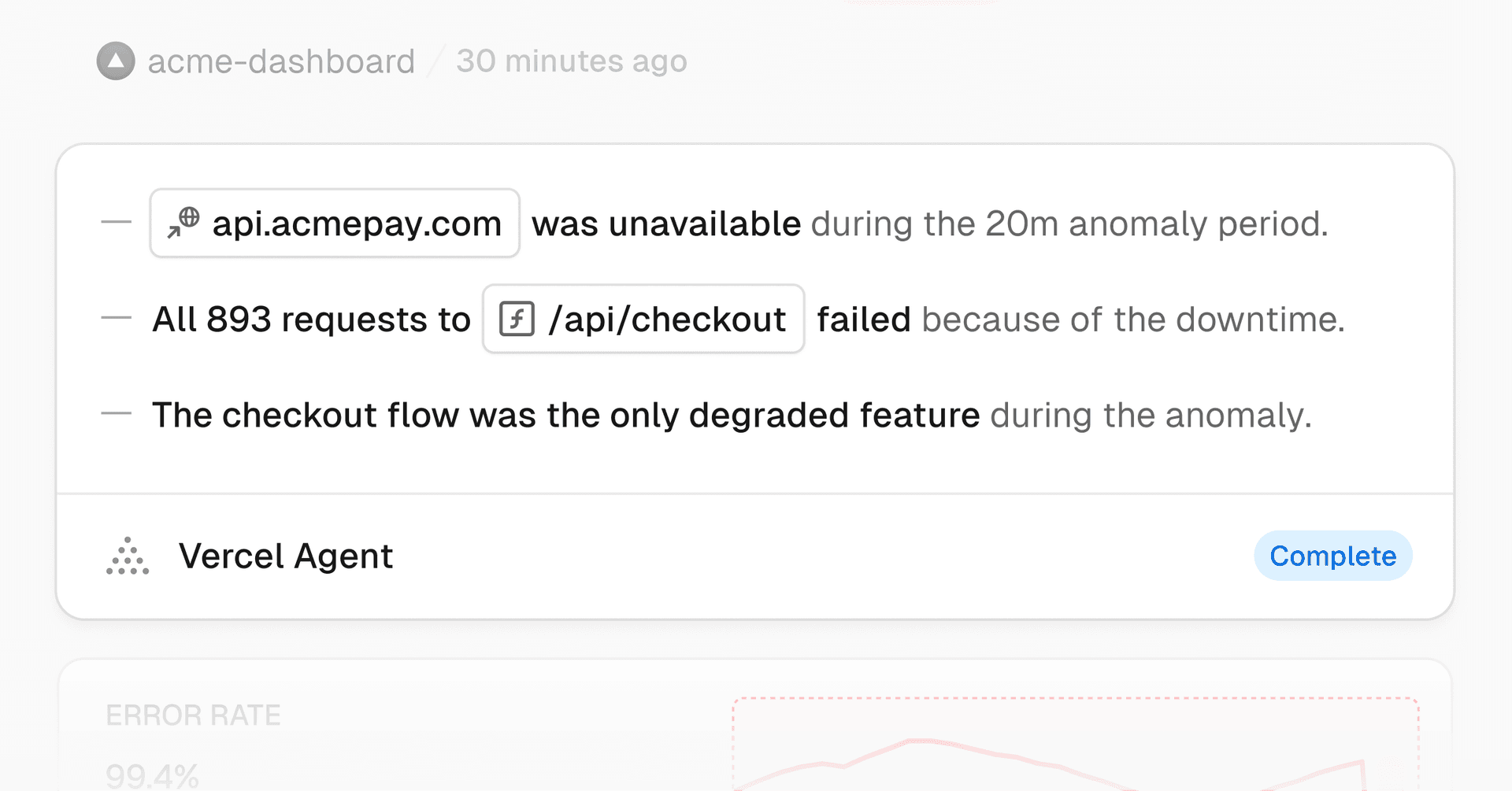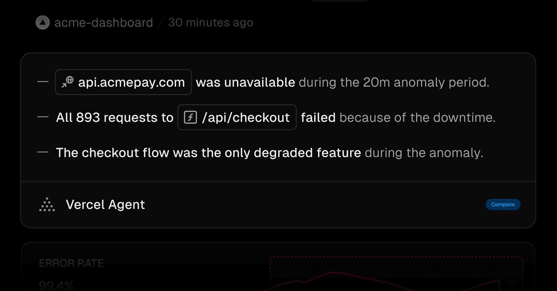 When an anomaly alert detects suspicious activity, such as unexpected spikes in usage or errors, Vercel Agent can investigate the issue, identify the likely root cause, analyze the impact, and suggest next steps for remediation.