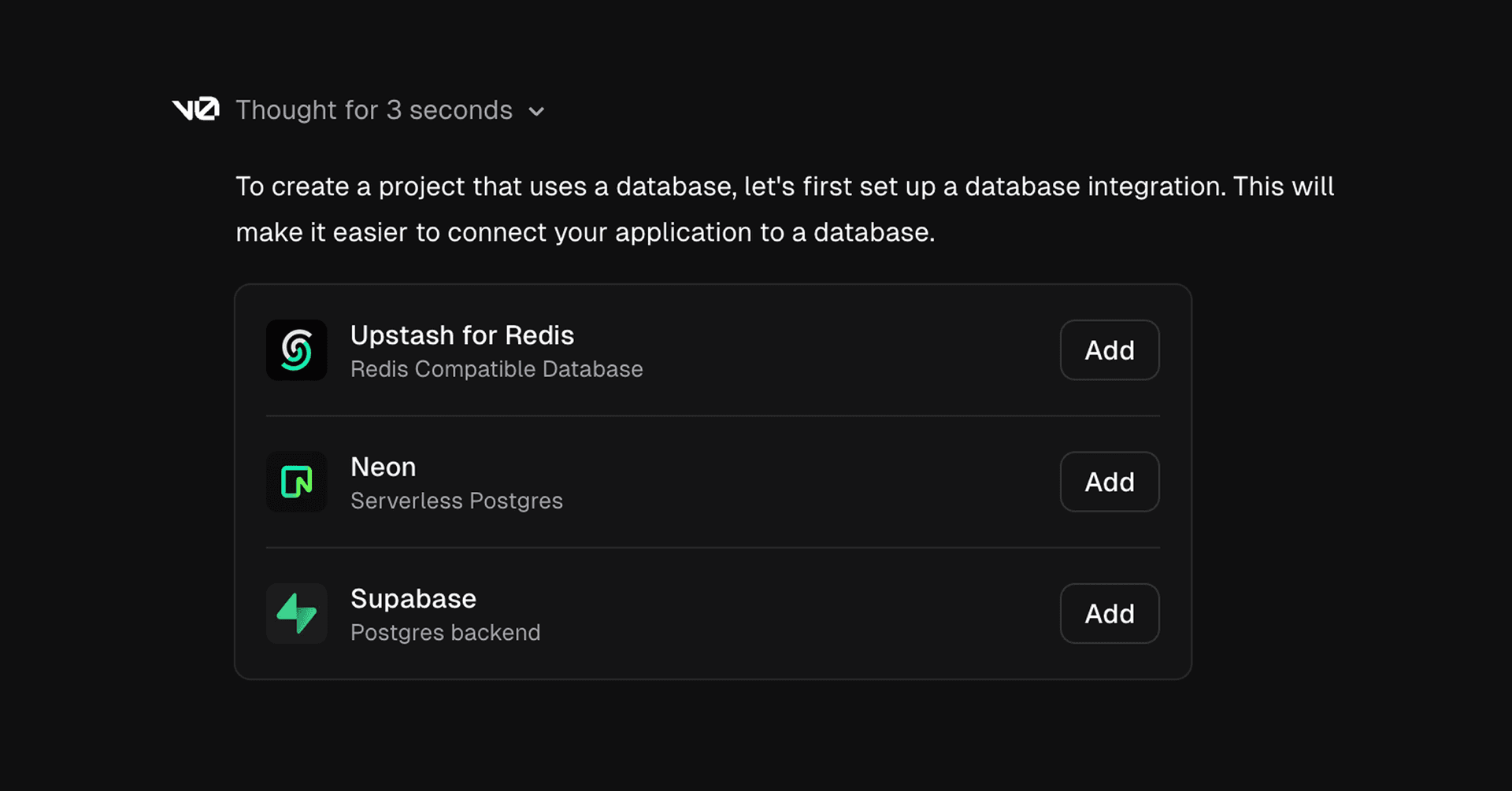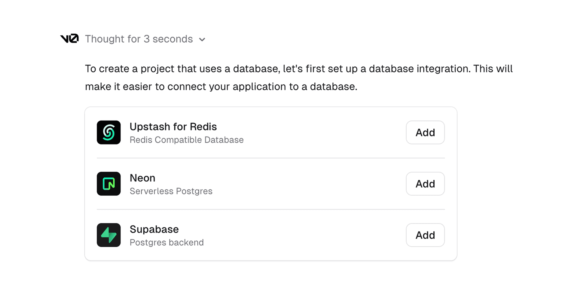 Users of v0—our collaborative AI assistant used to design, iterate, and scale full-stack applications—can now leverage integrations from the Vercel Marketplace, starting with Upstash, Neon, and Supabase.