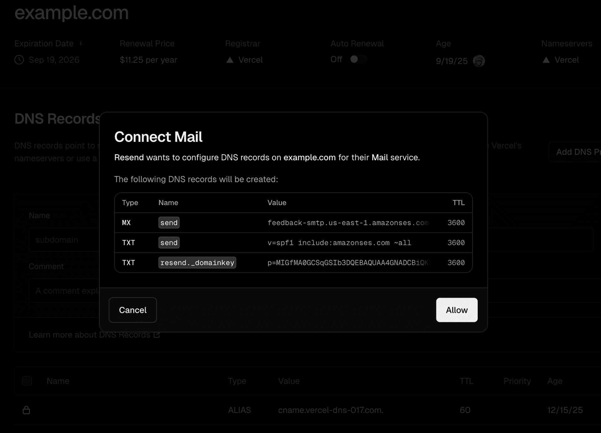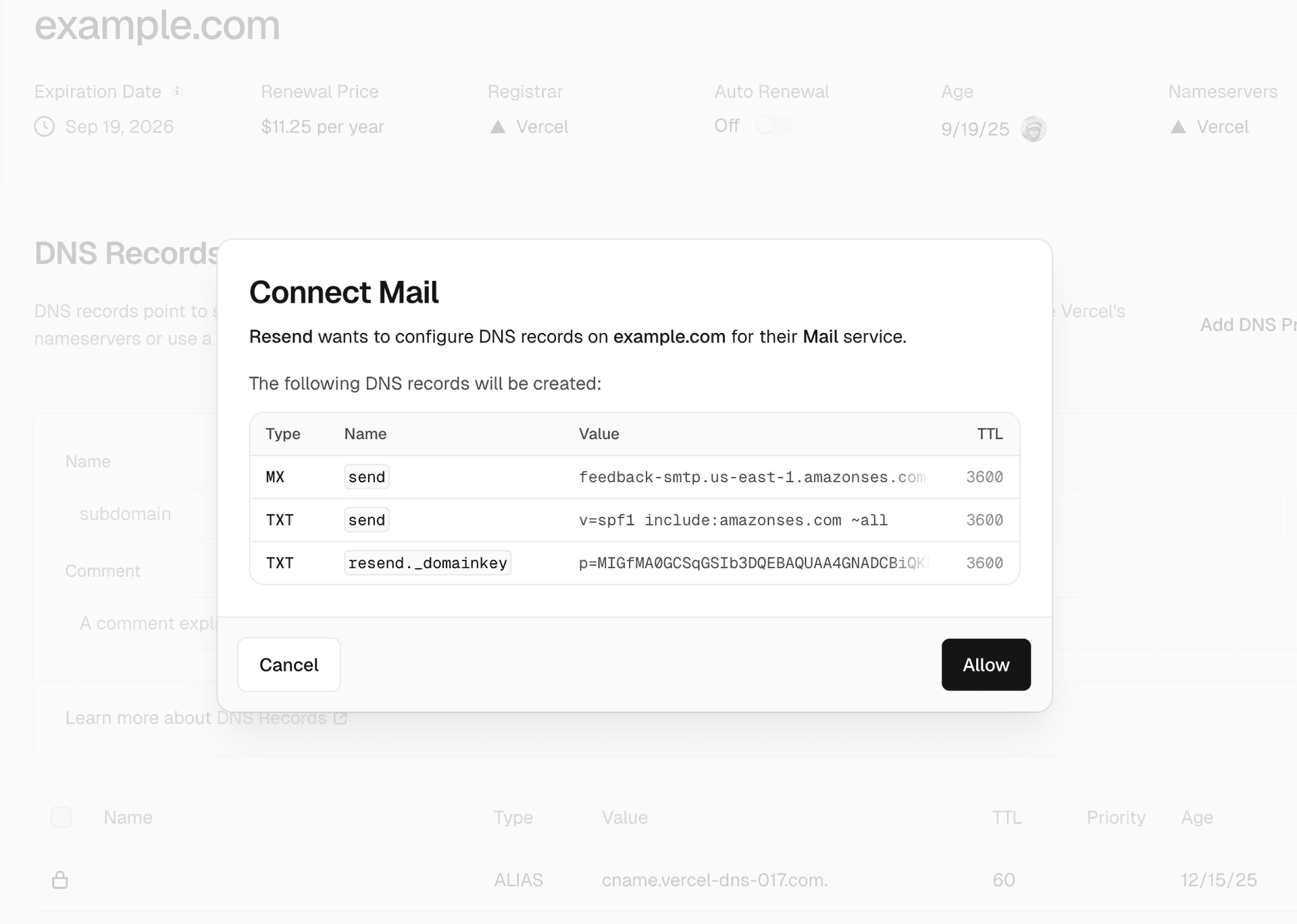We are launching this capability with Resend. When configuring email for a custom domain in Resend, teams can automatically provision the necessary DNS records directly on their associated Vercel domain.