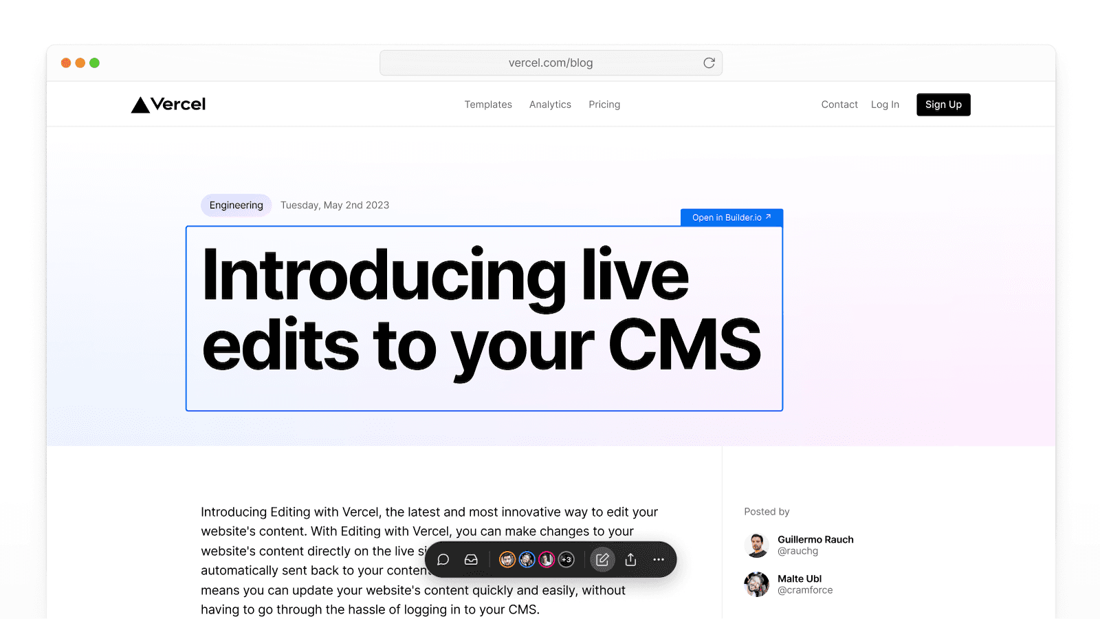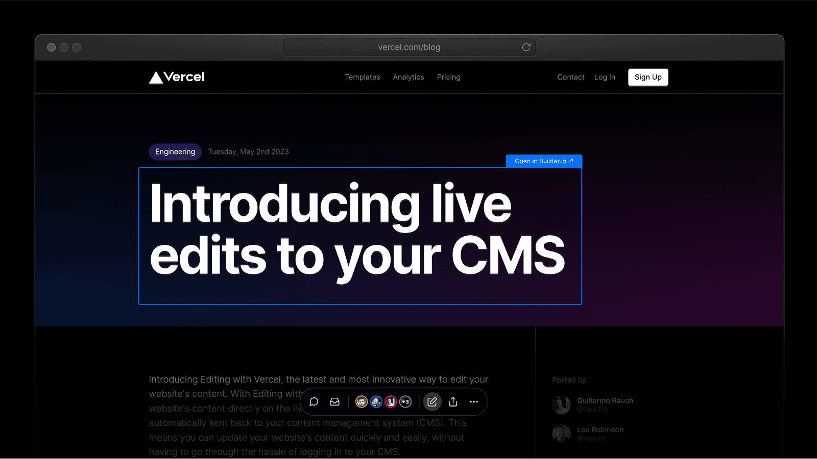 With Visual Editing you can click-to-edit content on your Vercel site, with a direct link to exactly where your content lives in your CMS.