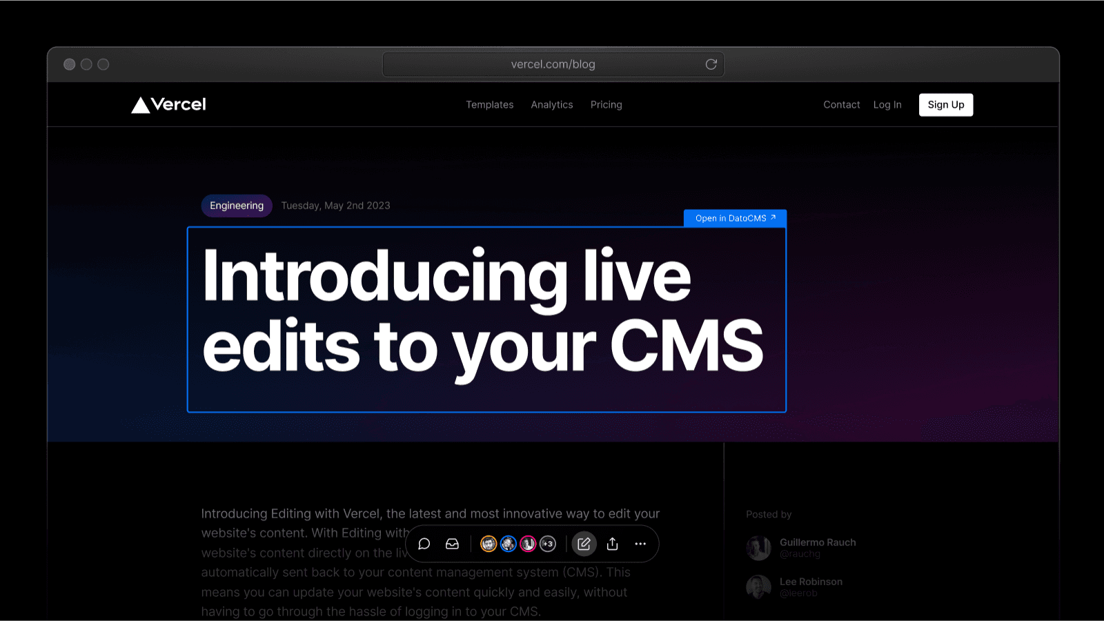 Visual Editing from Vercel allows you to click-to-edit content on your site, with a direct link to exactly where your content lives in your CMS.