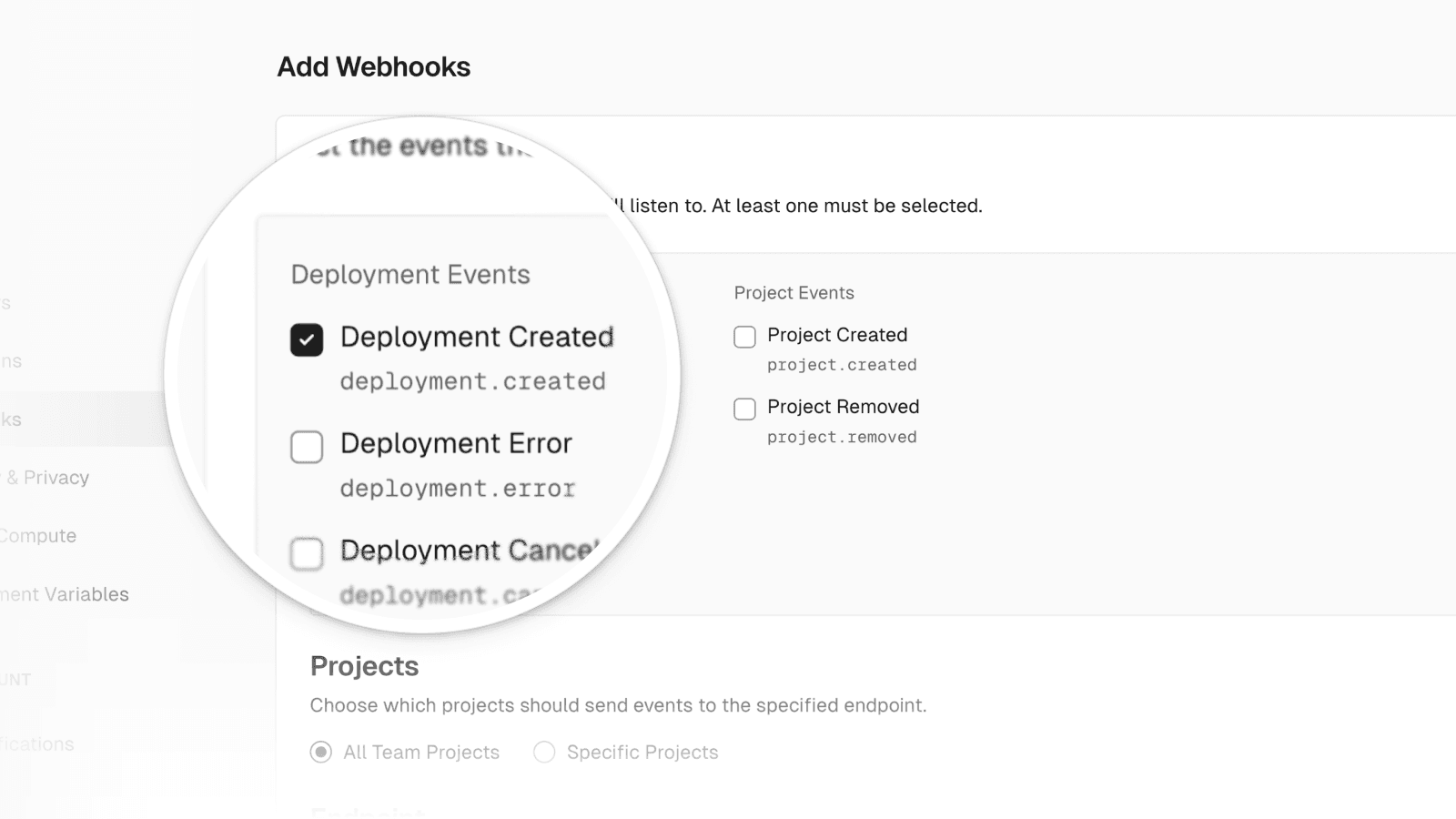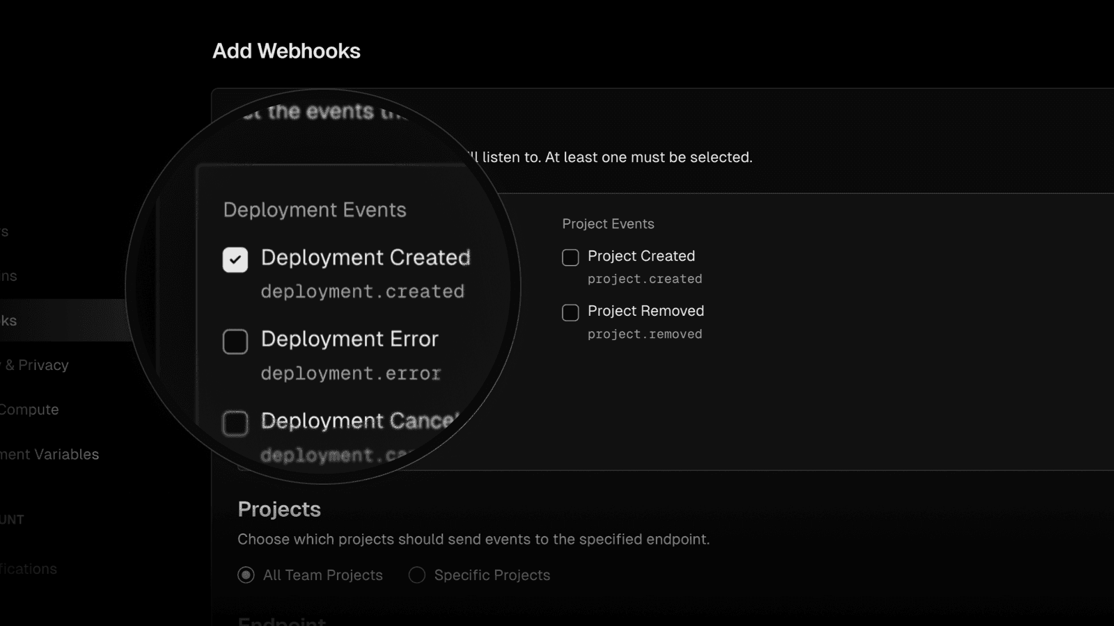 Webhooks allow you to get notified through a defined HTTP endpoint about certain deployment or project events that happened on the Vercel platform.