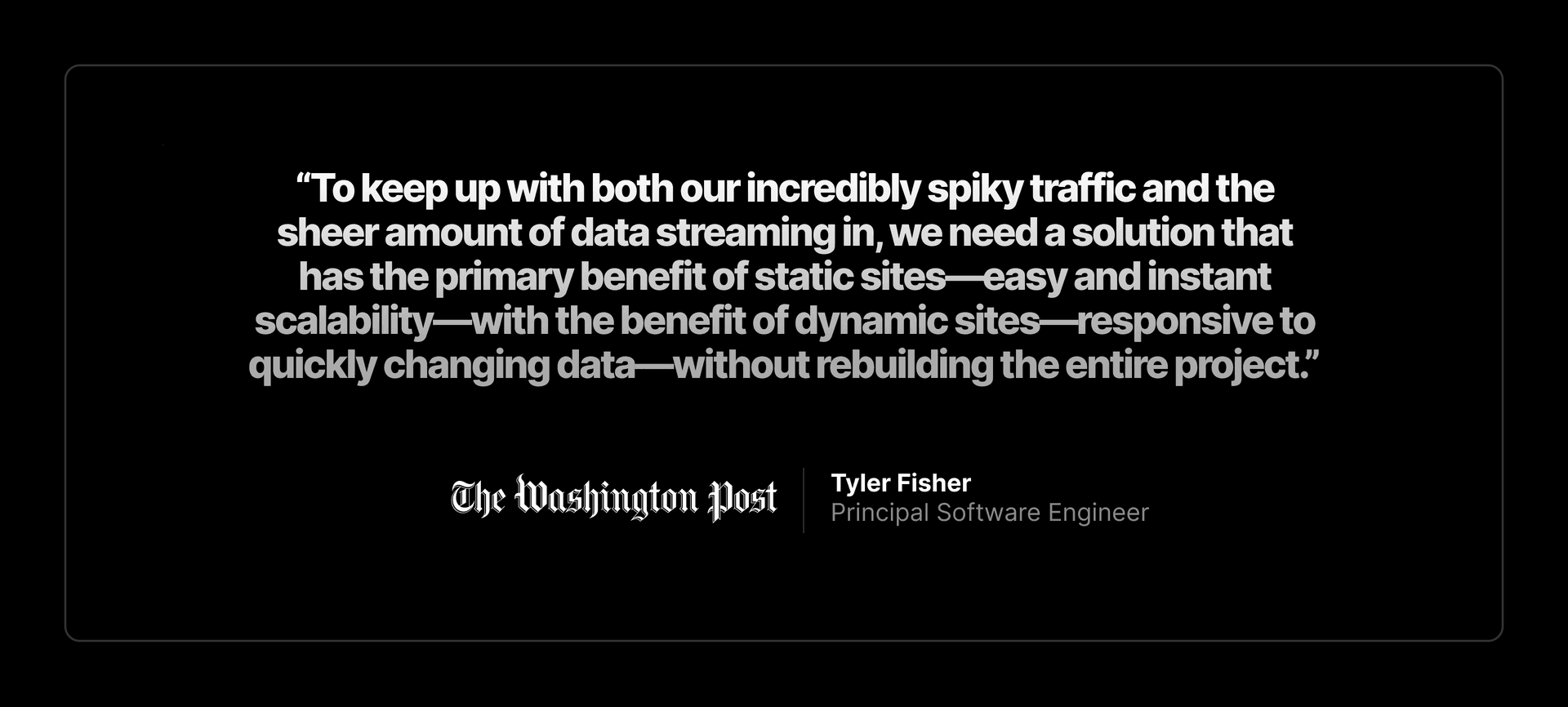 “To keep up with both our incredibly spiky traffic and the sheer amount of data streaming in, we need a solution that has the primary benefit of static sites—easy and instant scalability—with the benefit of dynamic sites—responsive to quickly changing data—without rebuilding the entire project,” says Fisher.