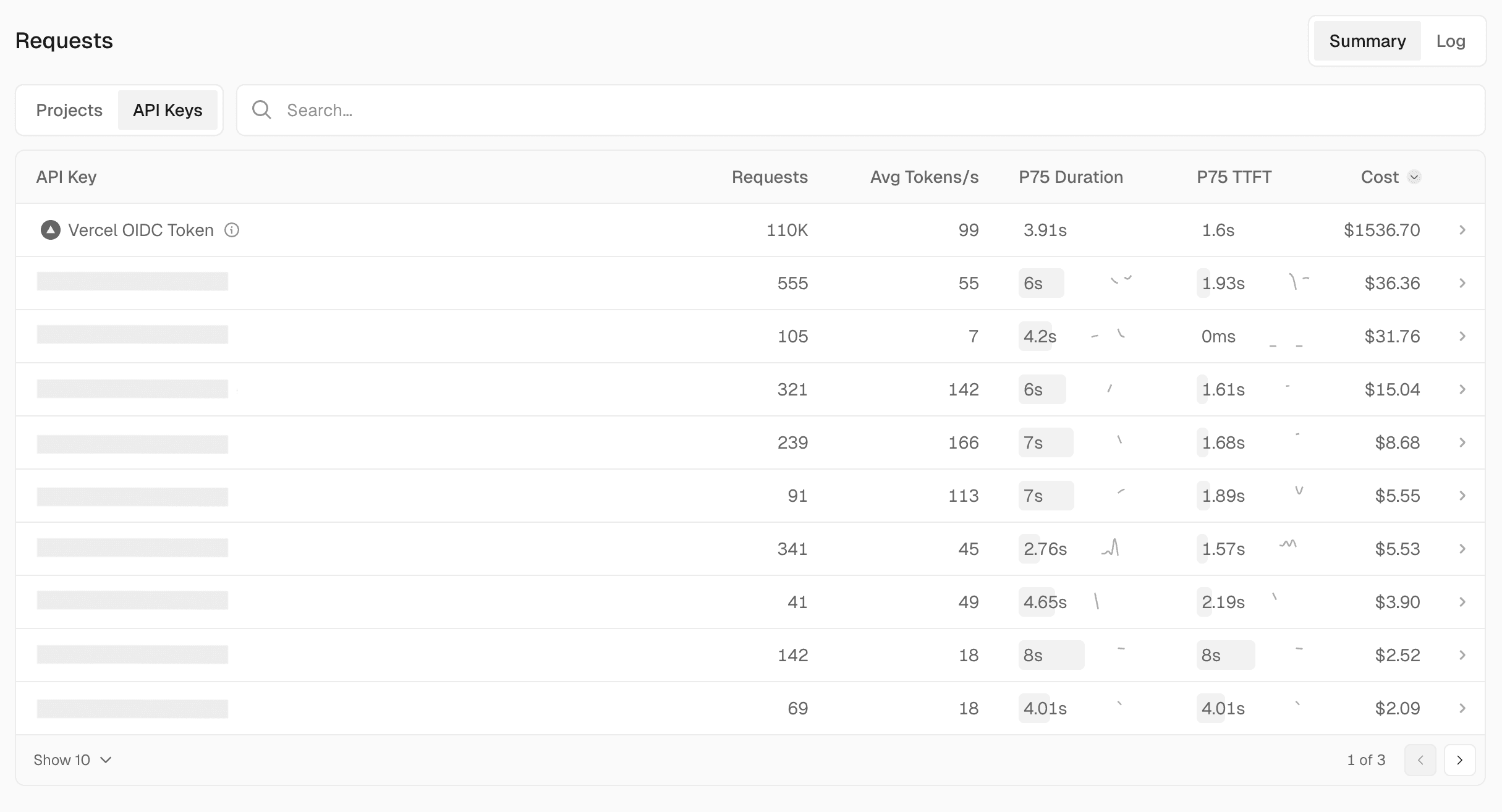 - Requests: Summaries by project, API key, and a detailed log of all requests