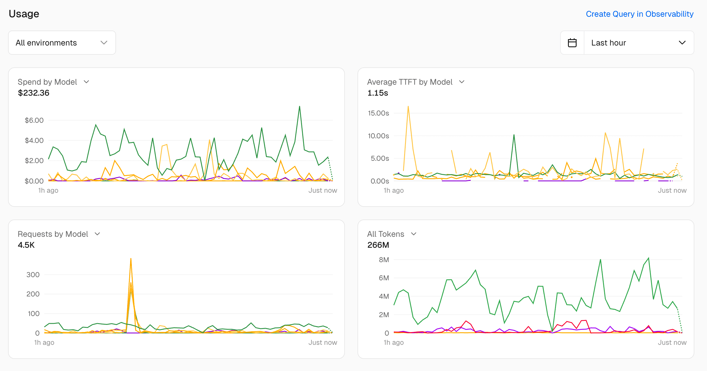 The AI Gateway logs spend, model usage, and observability metrics related to your requests, which you can use to monitor and debug.