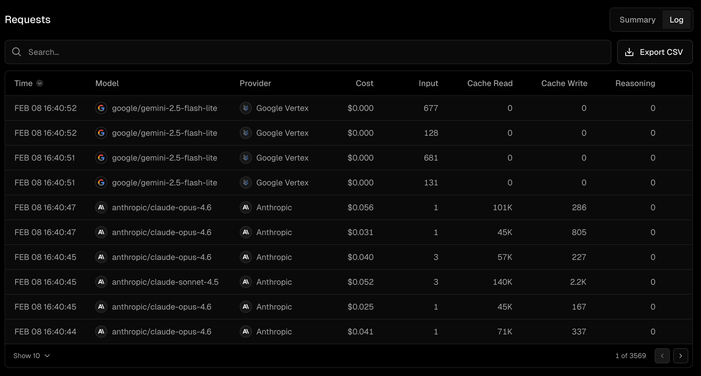 View a detailed log of all requests made to the AI Gateway, including all token types and the cost for each request. You can sort or export the logs for the selected time frame.