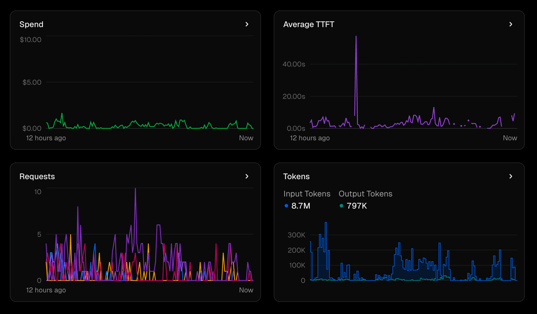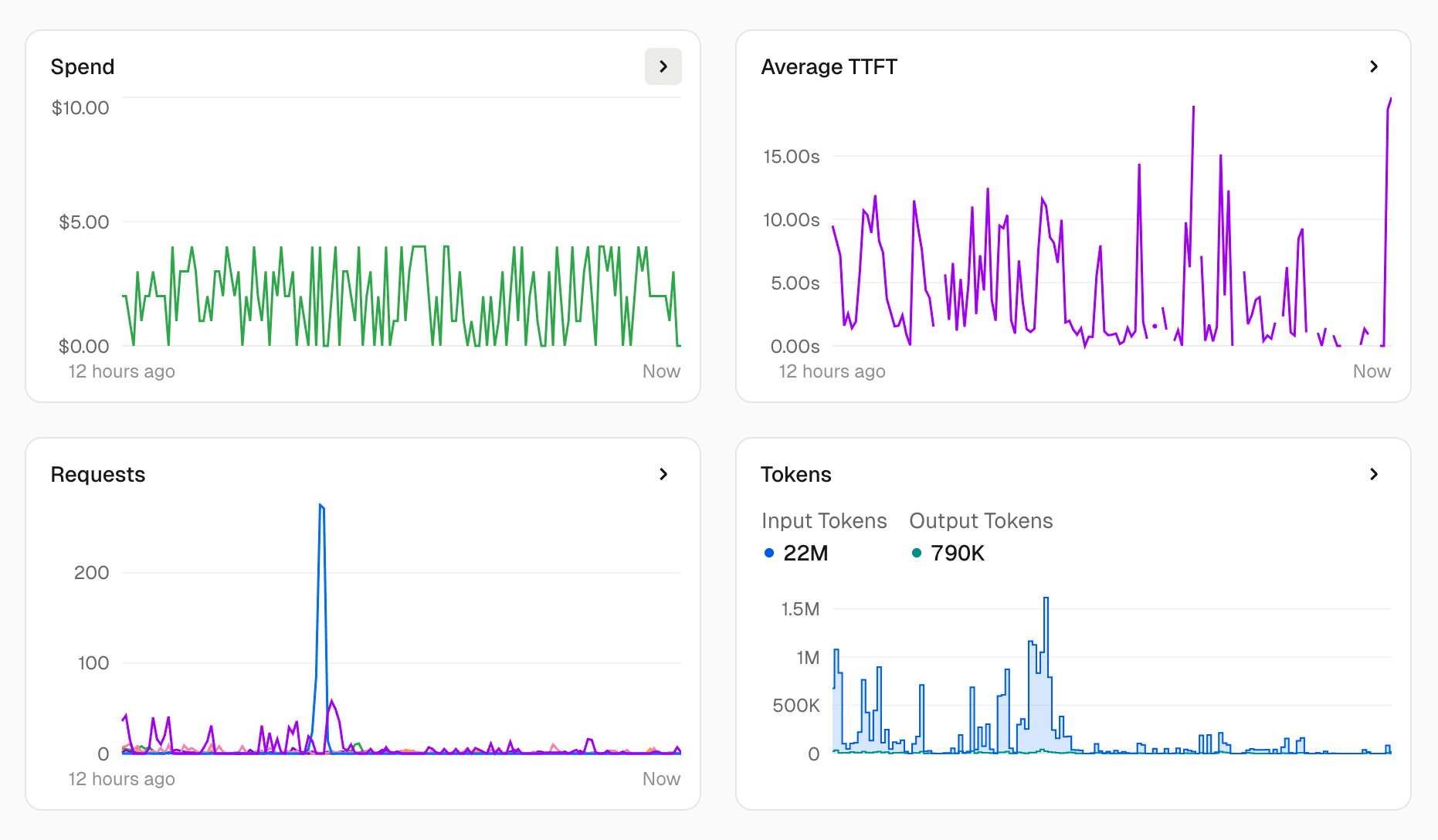 The Time to First Token chart shows the average time it takes for the AI Gateway to return the first token of a response. This can help you understand the latency of your requests and identify any performance issues.