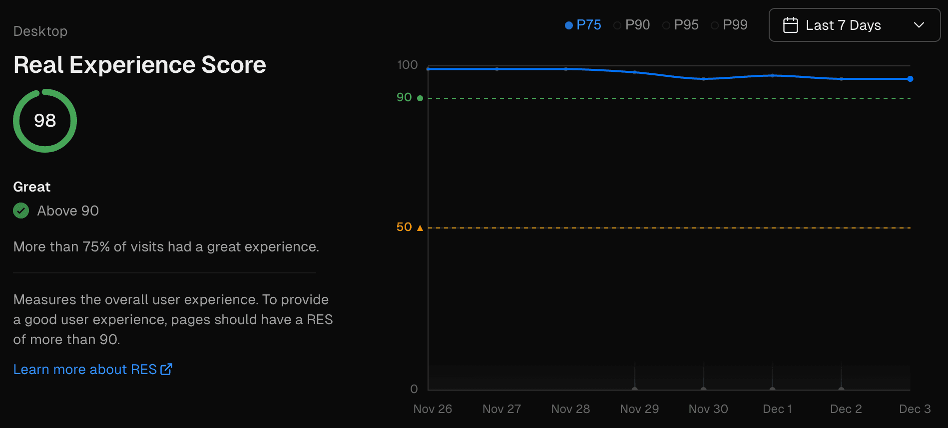 The Real Experience Score is a weighted average of all individual metric scores. Vercel has assigned each metric a specific weighting, which best represents user's perceived performance on mobile and desktop devices.